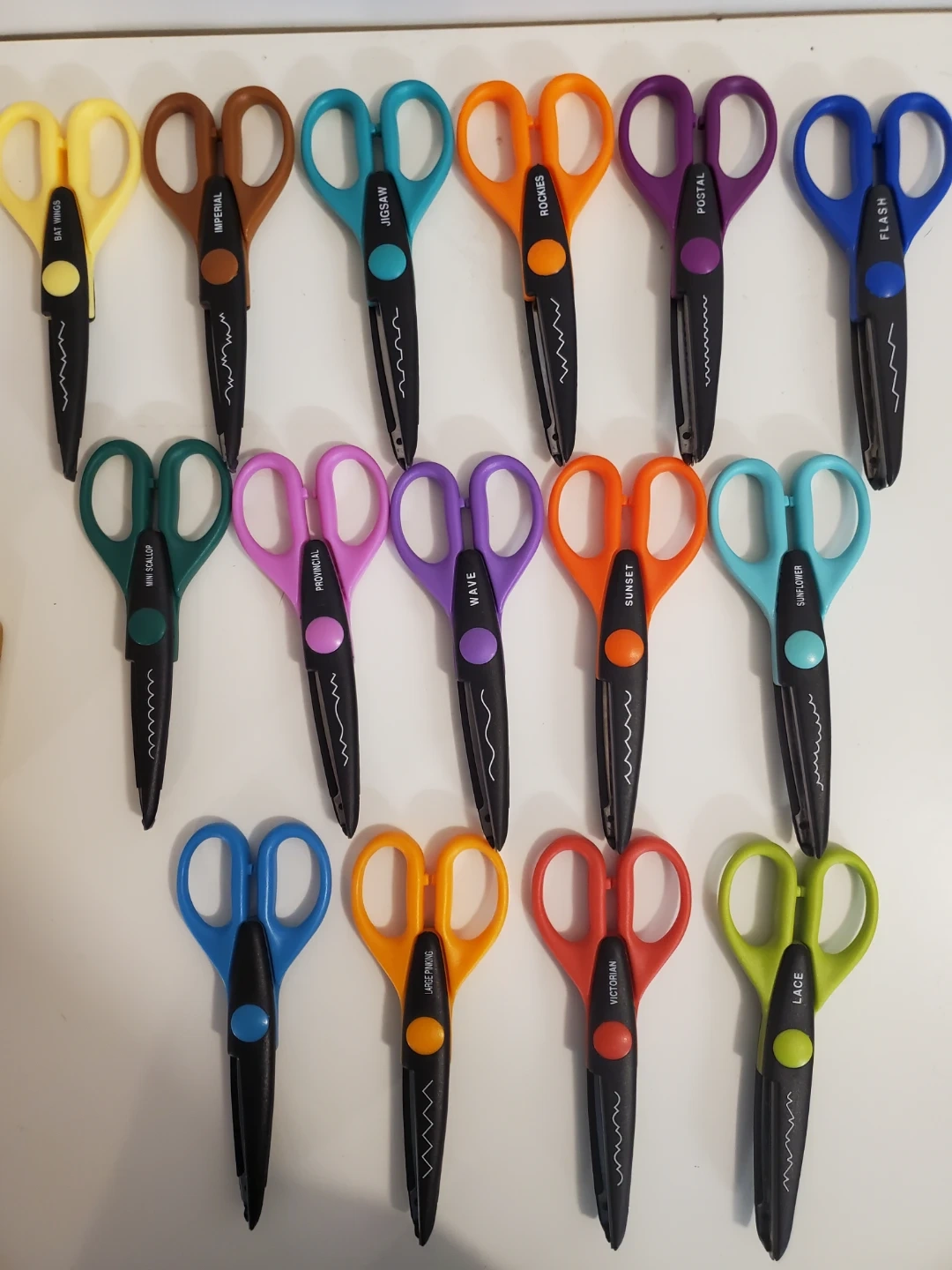 It includes 15 pairs of scissors, each with a unique cutting pattern for creating decorative edges on paper.Â