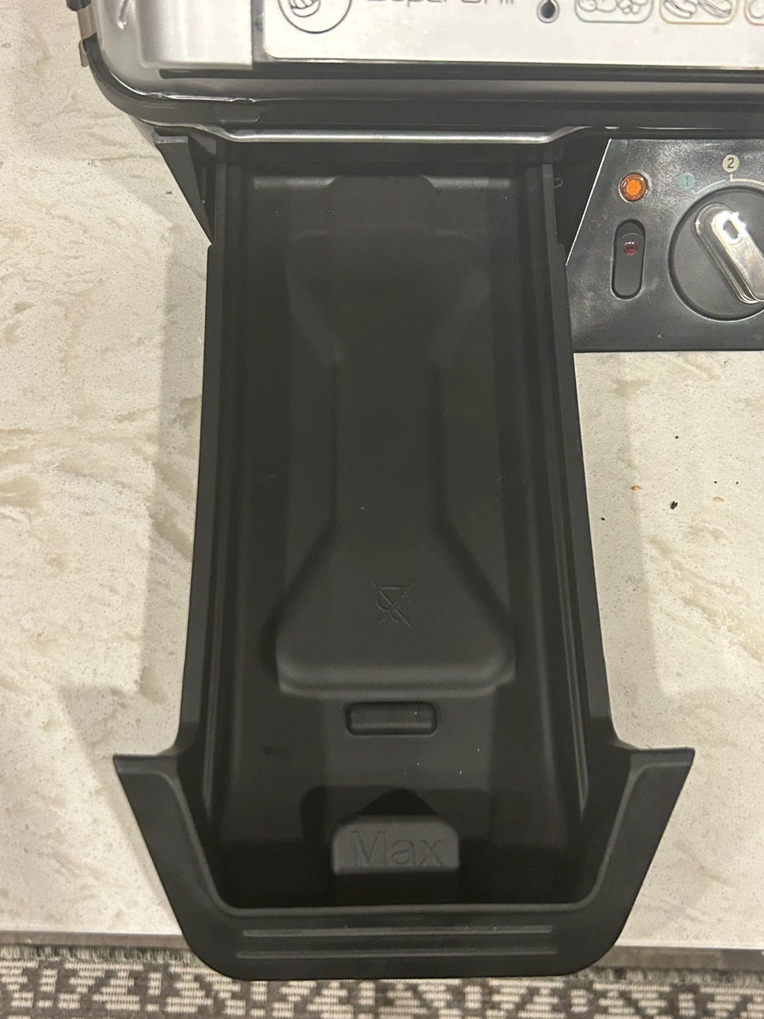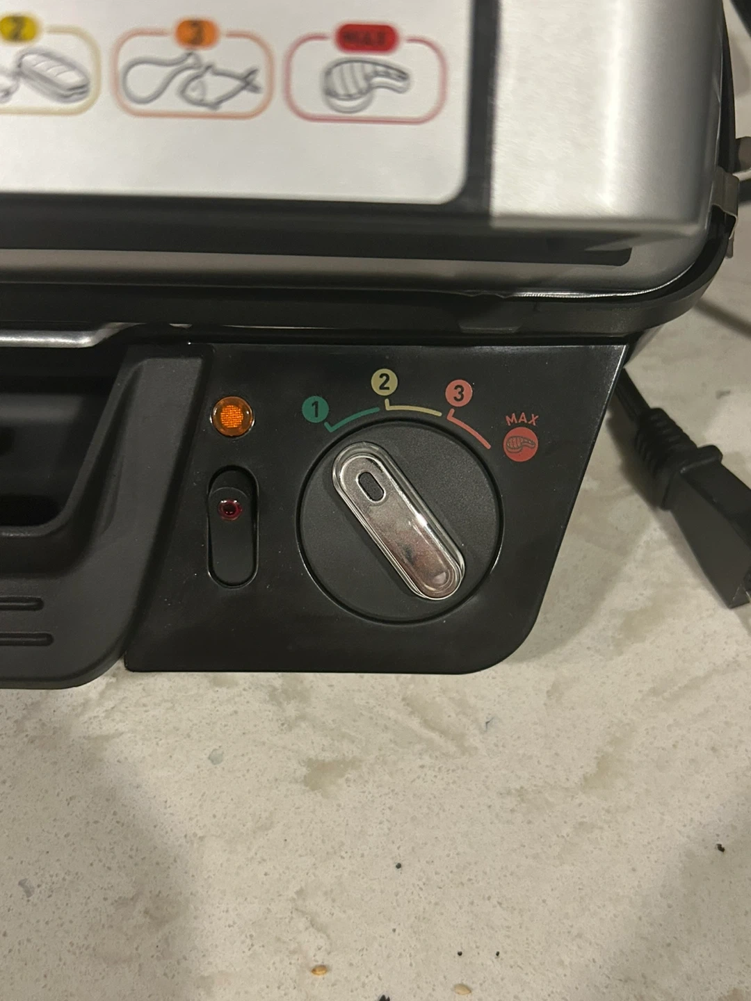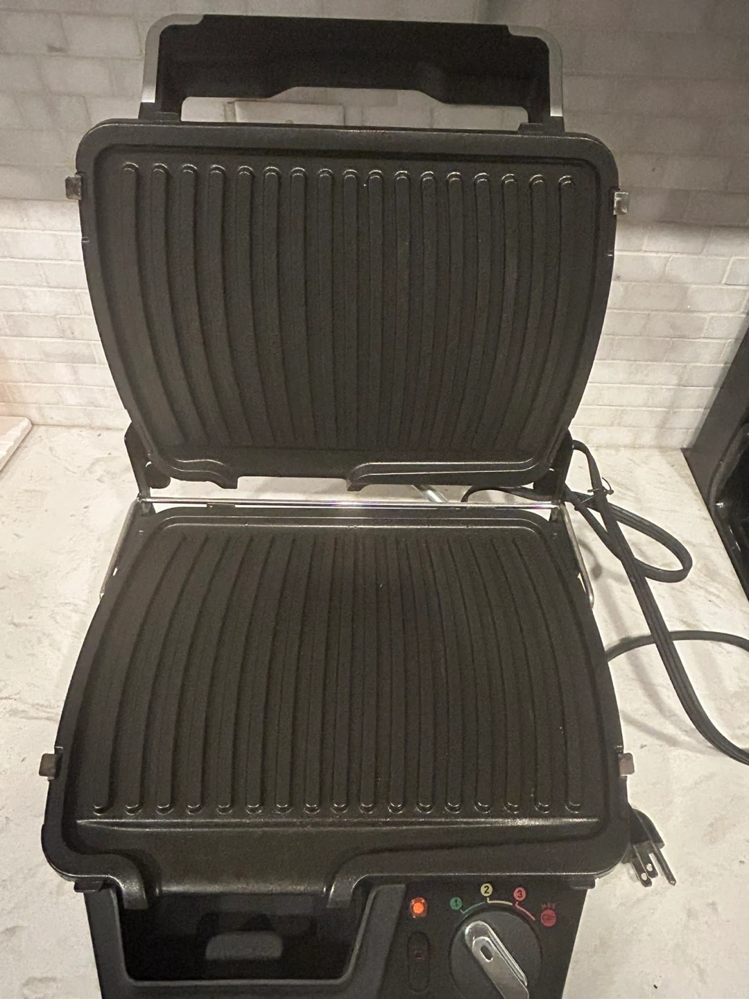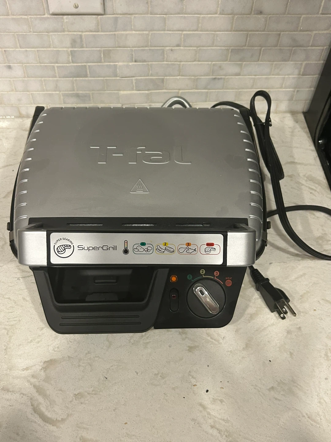 It's a T-fal SuperGrill indoor grill with super searing capability. Features adjustable temperature control from 1 to 3, with a Max setting. Includes a removable drip tray for grease collection. Only used once.