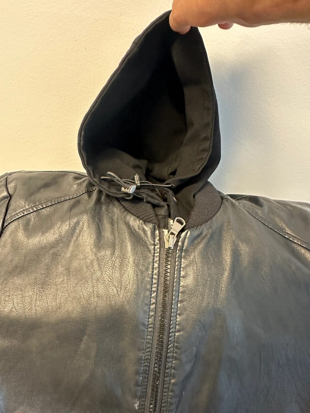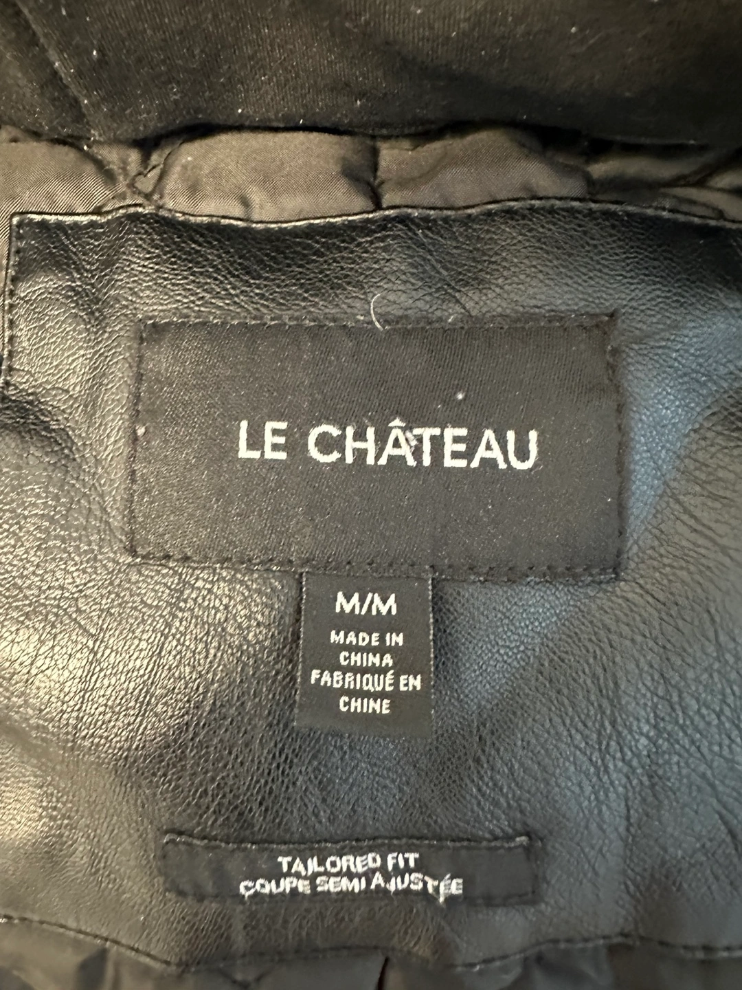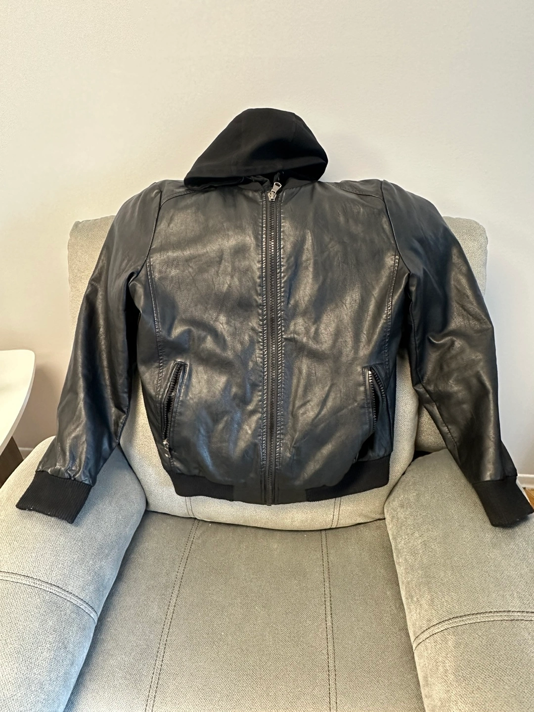 Men's black faux leather jacket. Size Medium. Features a hood and zipper closure. Tailored fit. Made in China.