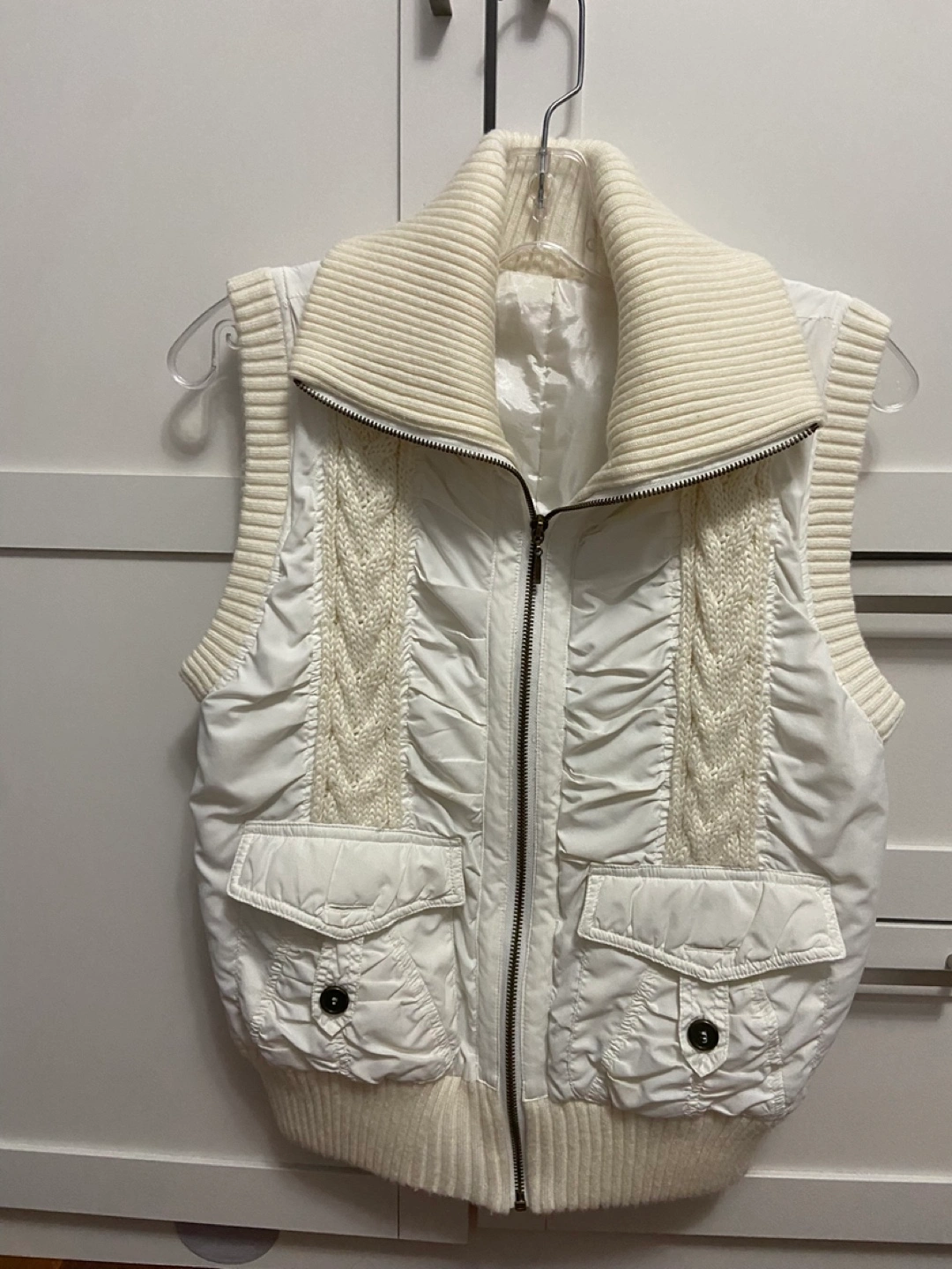 This is a white sleeveless vest featuring a cozy cable knit collar and trim. It has a zippered front closure and two button-flap pockets. Good condition, no issues. Just rarely wear. Nice and warm for layering