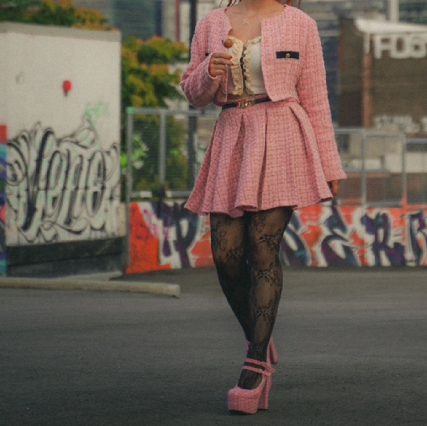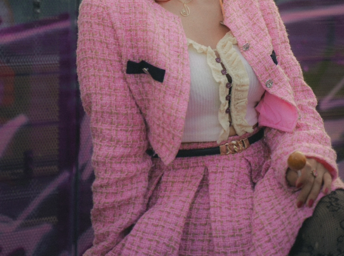 This is a pink tweed skirt suit. It includes a cropped jacket and a skirt. Size s. If you want to buy the 2 piece set together with high heels with the same material as set, it will be extra 50$