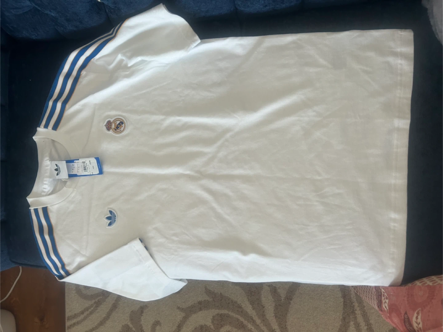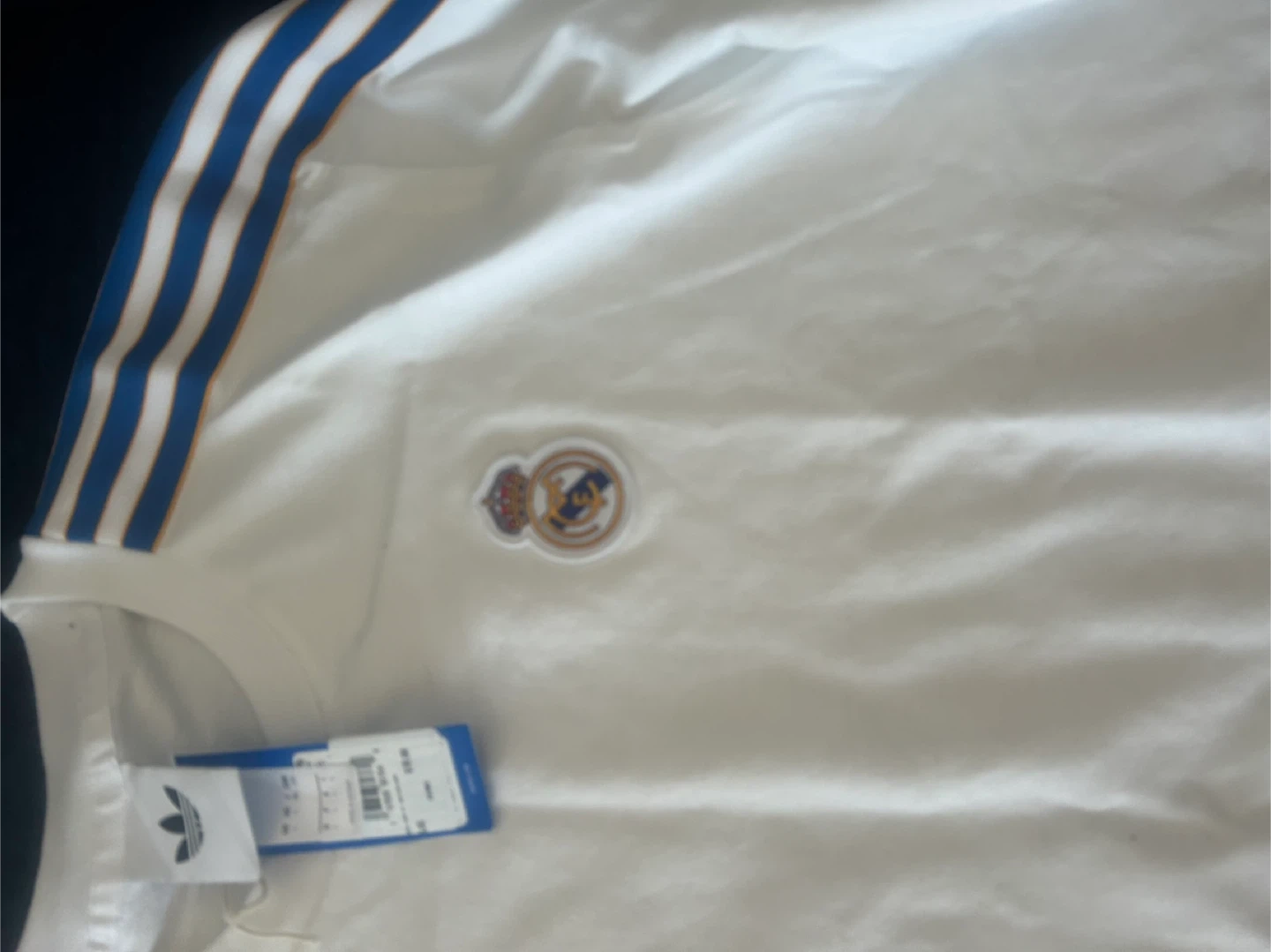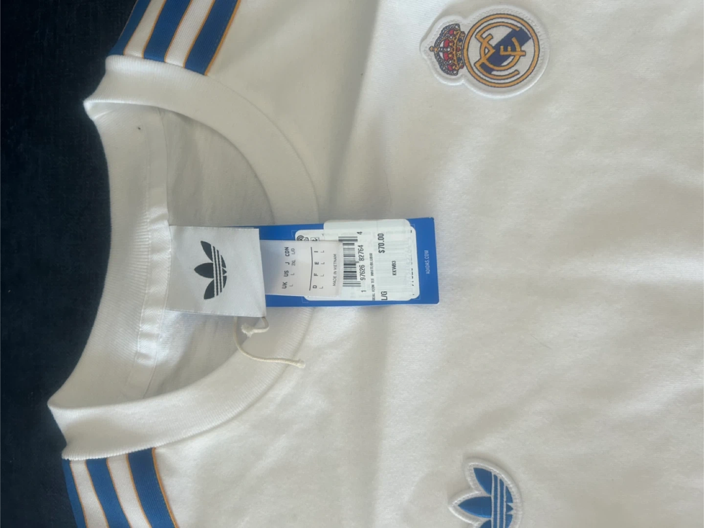 White Adidas t-shirt featuring the Real Madrid crest and signature three stripes on the sleeves. Size is large. Made in Vietnam. Original price $70.00.