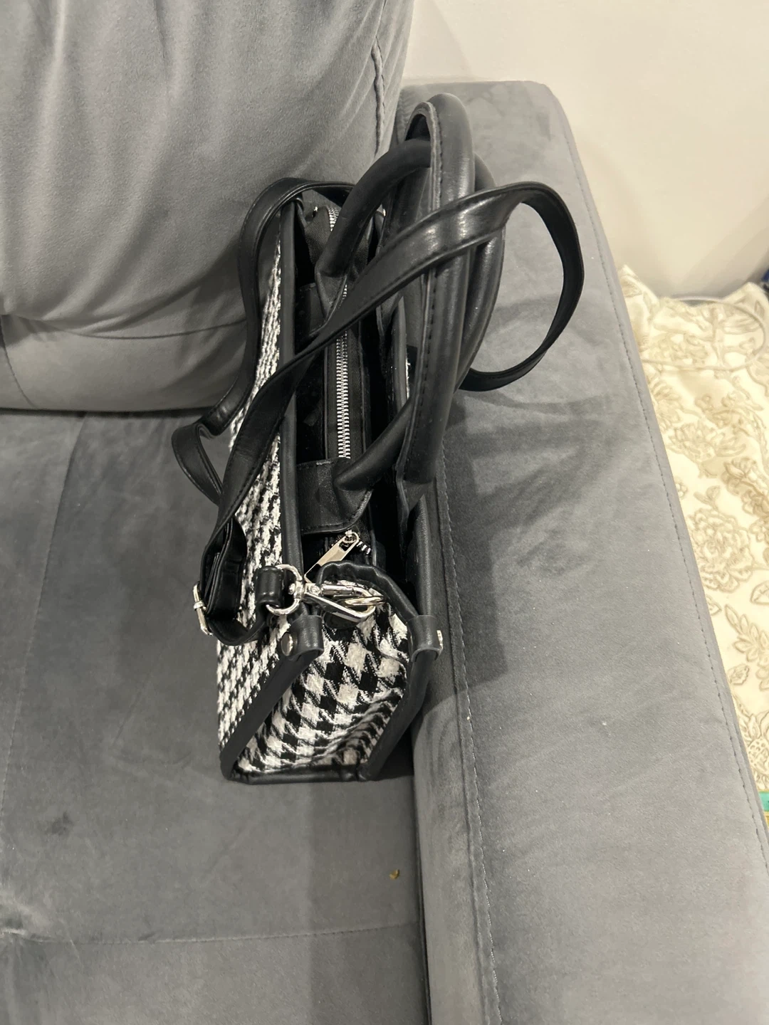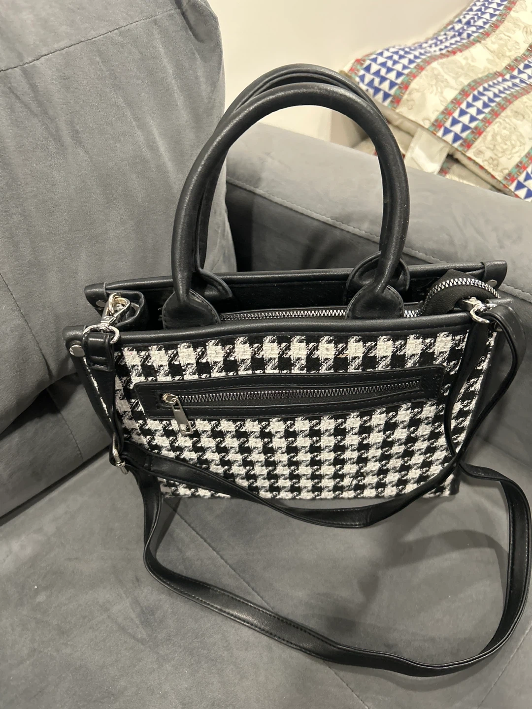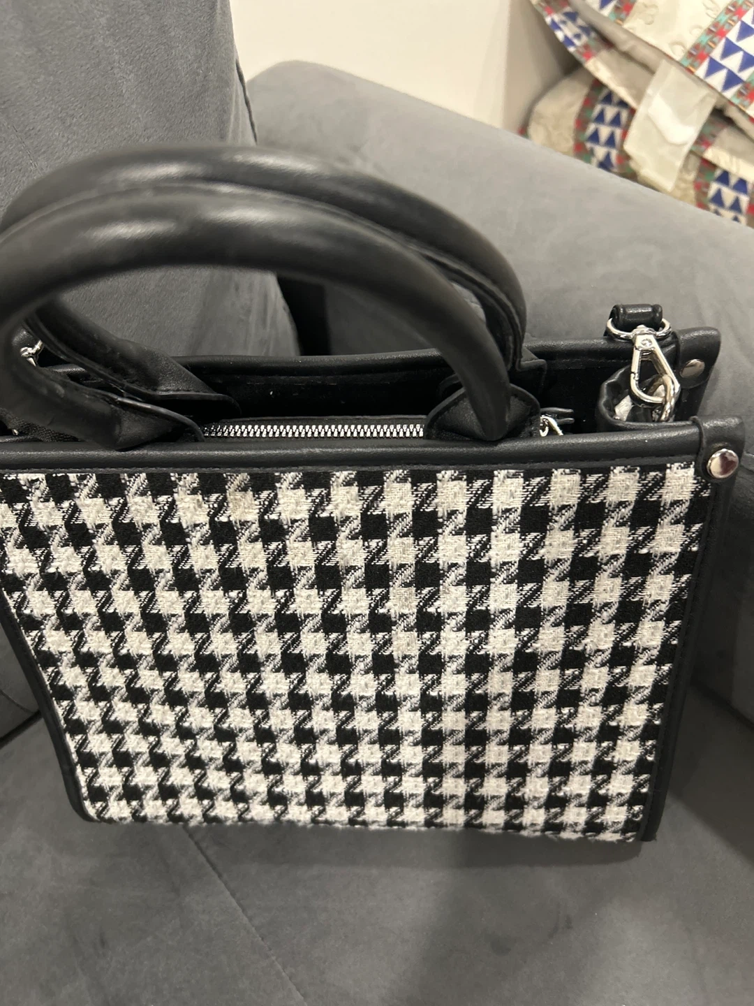 Houndstooth print mini tote bag with black faux leather trim and handles. Features a zippered main compartment and a detachable shoulder strap. It's a stylish accessory for everyday use!