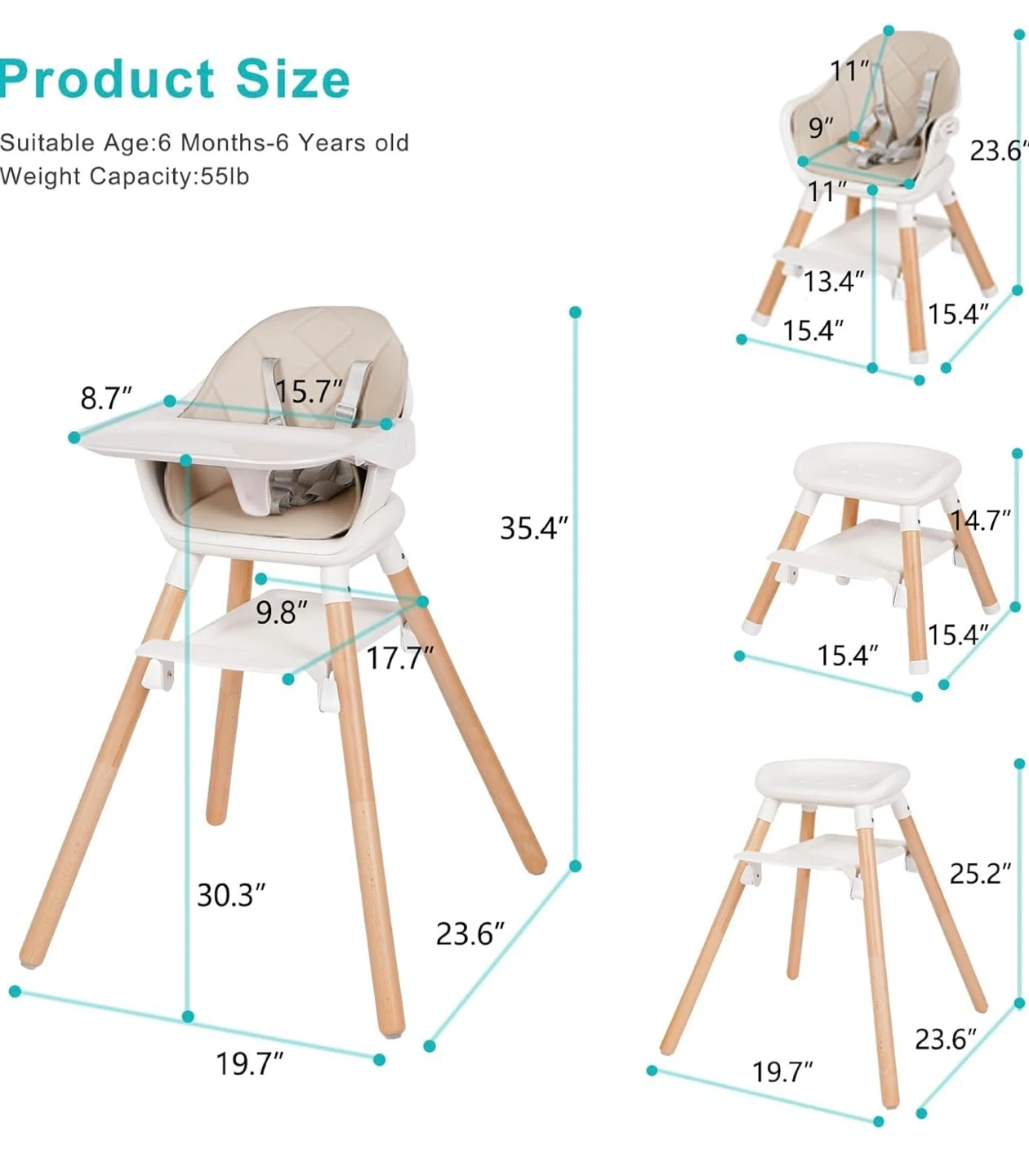 This factory-sealed 6-in-1 wooden convertible high chair in beige is the perfect addition to your baby's mealtime routine. This versatile high chair converts into six different modes to grow with your child, from a baby high chair to a small stool. The chair features a removable and double tray for easy cleaning, a 5-point safety harness, and a stable structure.