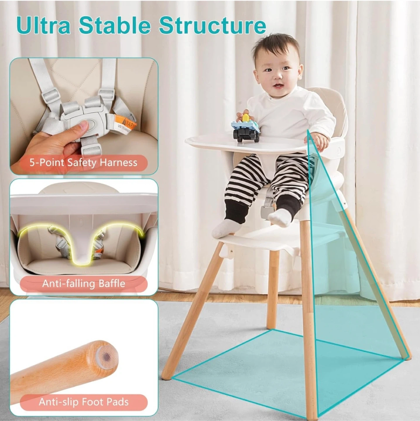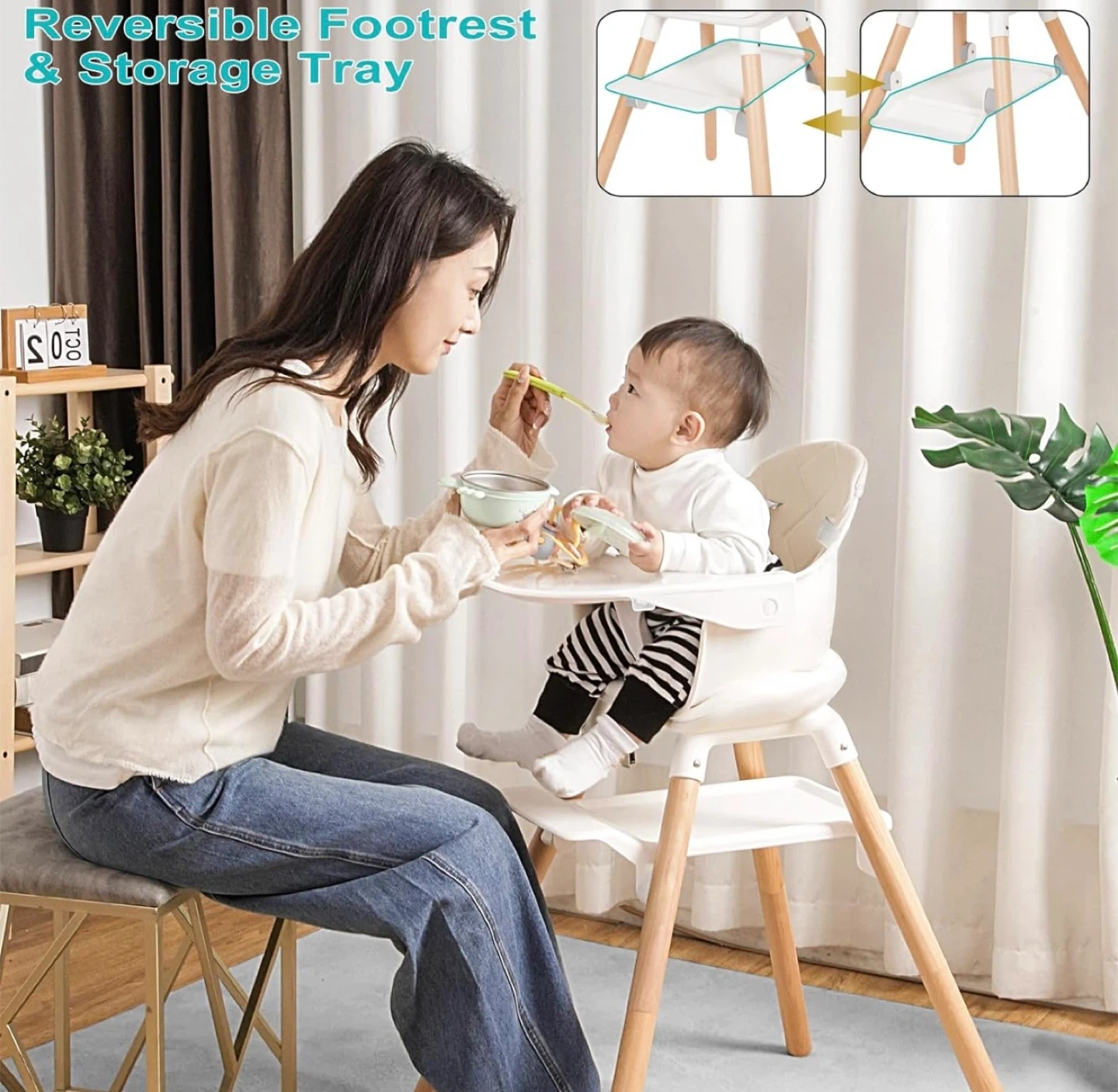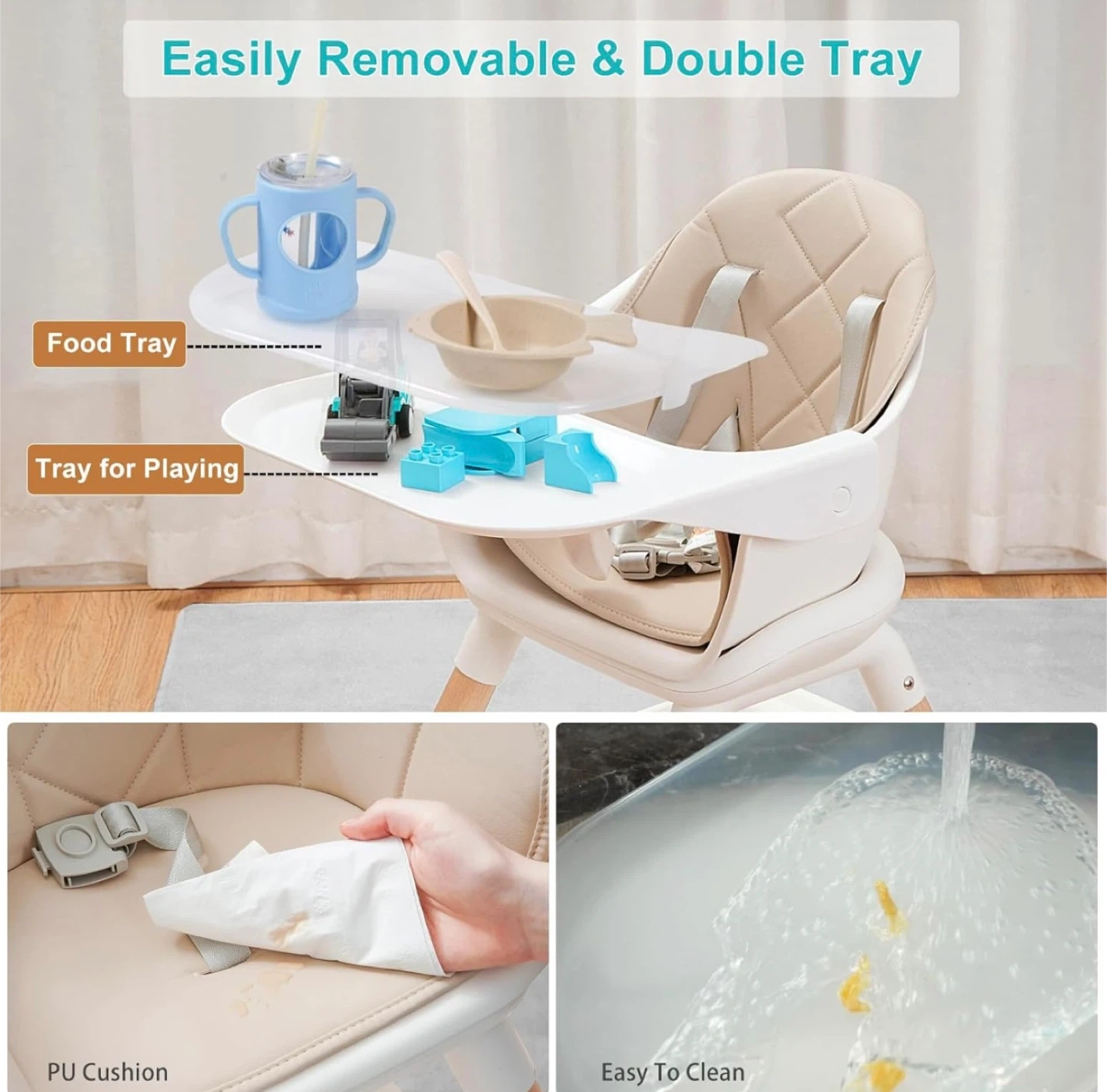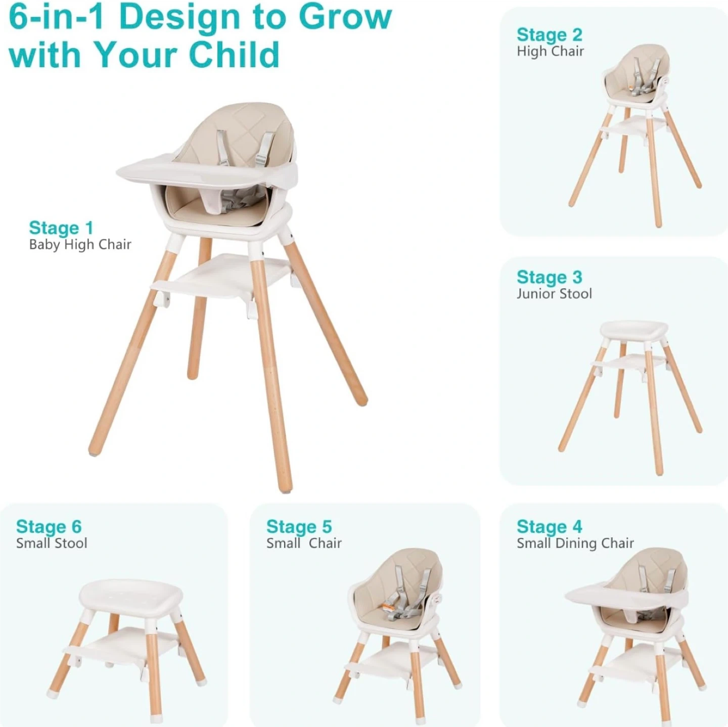 This factory-sealed 6-in-1 wooden convertible high chair in beige is the perfect addition to your baby's mealtime routine. This versatile high chair converts into six different modes to grow with your child, from a baby high chair to a small stool. The chair features a removable and double tray for easy cleaning, a 5-point safety harness, and a stable structure.