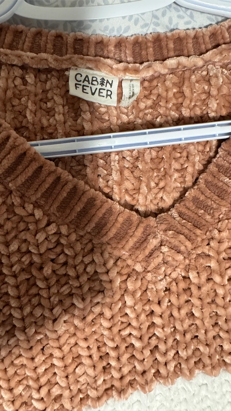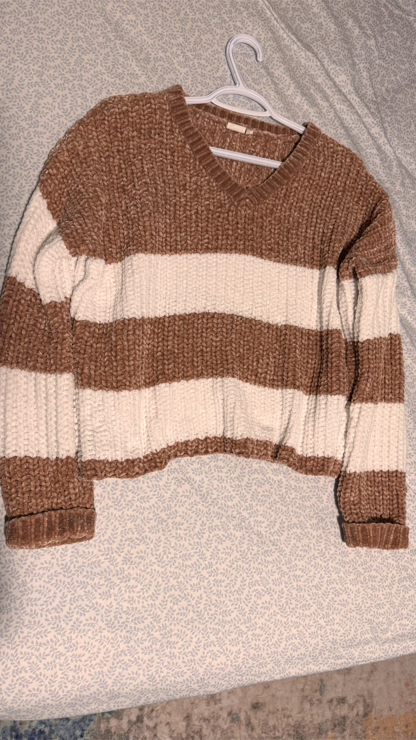 15Cozy Cabin Fever sweater with brown and white stripes! It's a soft, plush material and perfect for chilly days. The V-neck adds a nice touch. Would fit a variety of sizes depending on desired fit