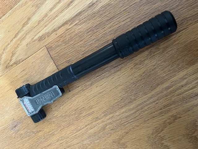 This is a used Barbieri Telescopic mini pump, 120 PSI, in good condition. It's a high-performance pump with a two-stage telescopic mechanism for easy high-pressure inflation. The valve lock lever ensures a secure attachment to the tire valve. It's compatible with UK, US, and French valves (adapter included by rearranging internal parts). Portable hand pump. Overall Length: 250mm. Weight: About 110g. Max Pressure: 8 atm (= 120 PSI). For Sale By: Owner.
