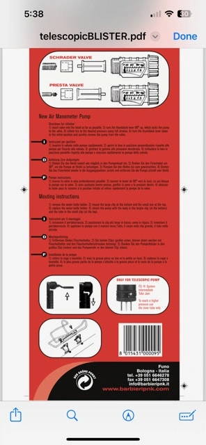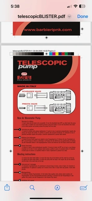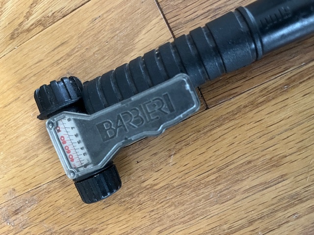 This is a used Barbieri Telescopic mini pump, 120 PSI, in good condition. It's a high-performance pump with a two-stage telescopic mechanism for easy high-pressure inflation. The valve lock lever ensures a secure attachment to the tire valve. It's compatible with UK, US, and French valves (adapter included by rearranging internal parts). Portable hand pump. Overall Length: 250mm. Weight: About 110g. Max Pressure: 8 atm (= 120 PSI). For Sale By: Owner.