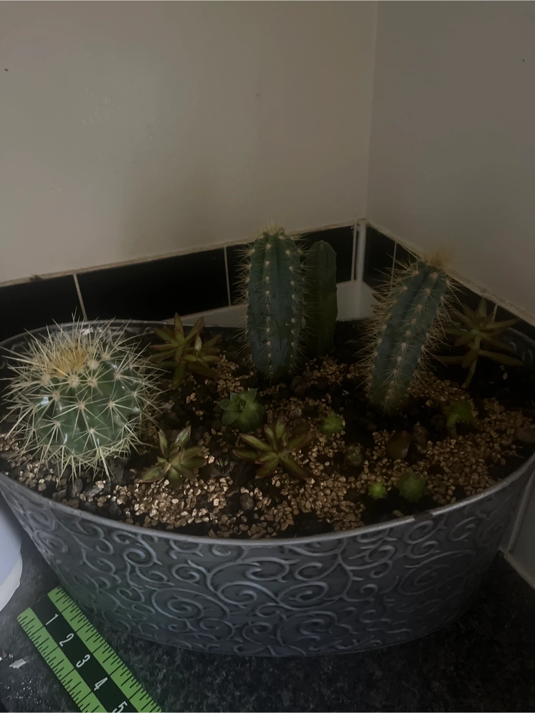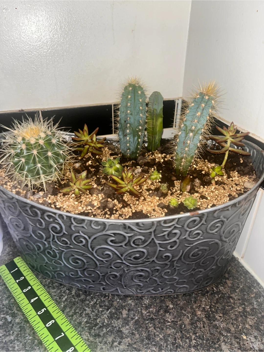 369A lovely arrangement of cacti and succulents in a decorative metal pot. The pot measures approximately 12 inches in height. Perfect for adding some greenery to your home!