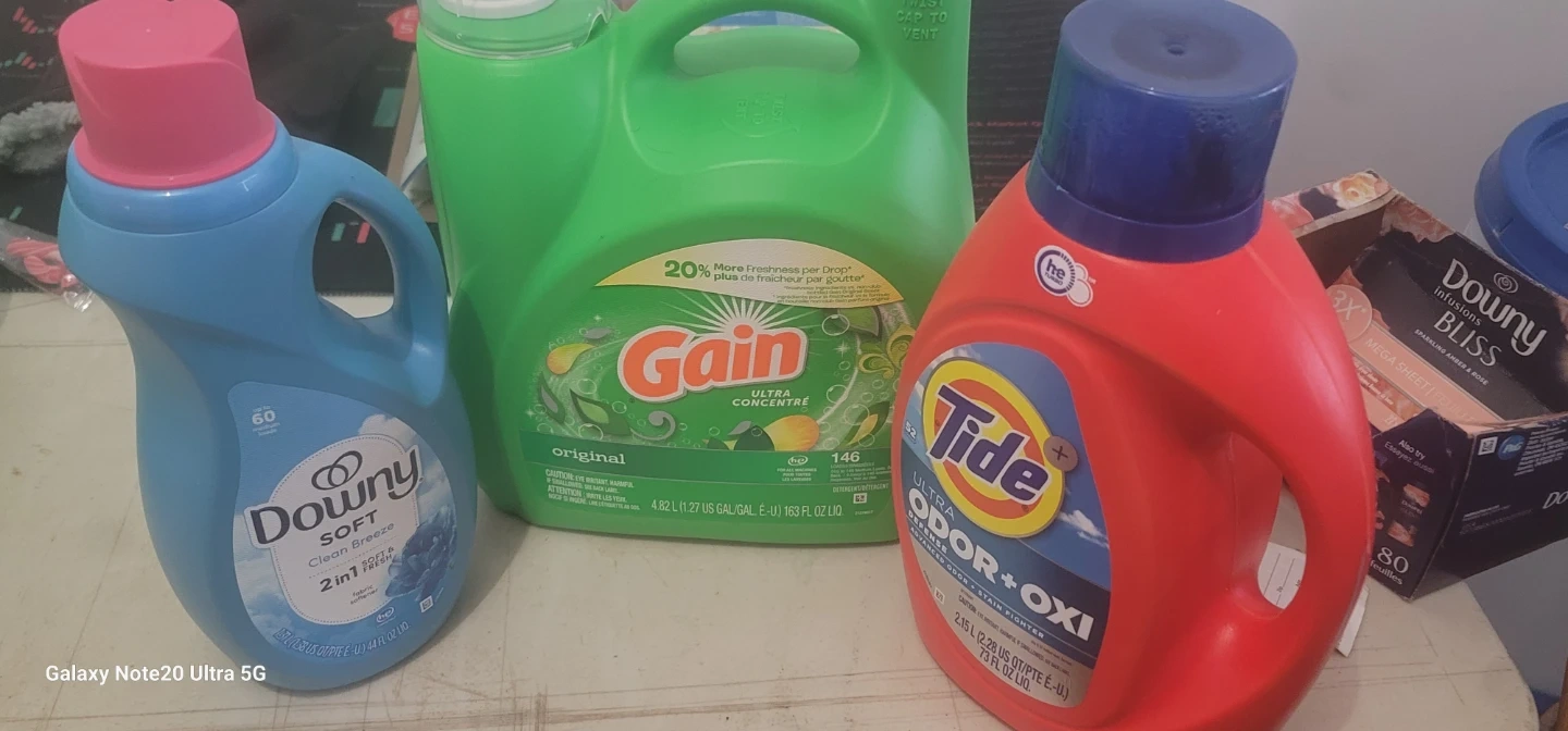 Selling three bottles of laundry detergent. There is Downy Soft Clean Breeze 2 in 1, Gain Ultra Concentre Original, and Tide Ultra Odor+Oxi.