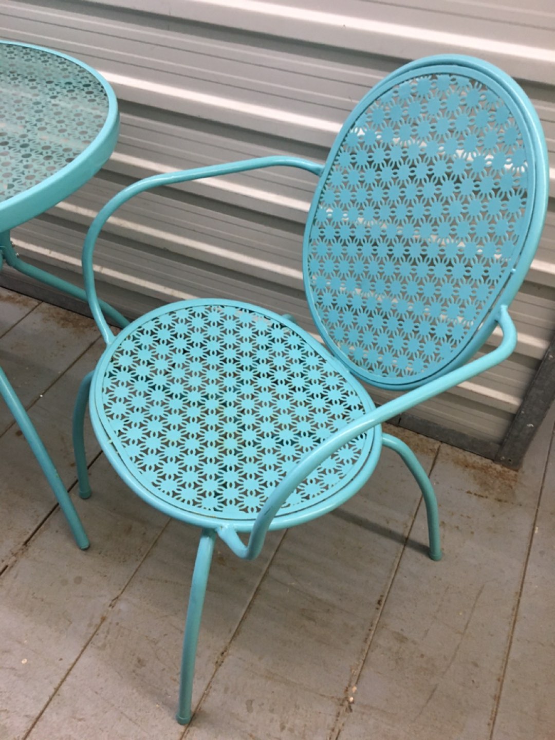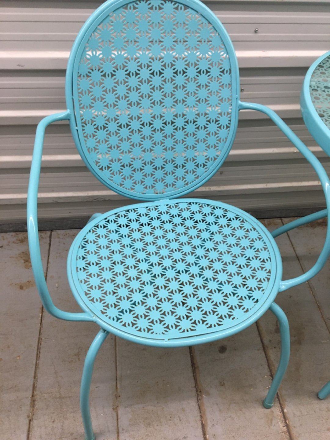 03-piece set: Table and 2 chairs Classic bistro-inspired design Powder-coated steel with tempered glass tabletop TABLE - Diameter - 27.6” Height - 28.3” CHAIRS - Width - 23.2” Depth - 22” Back Height - 33.5”