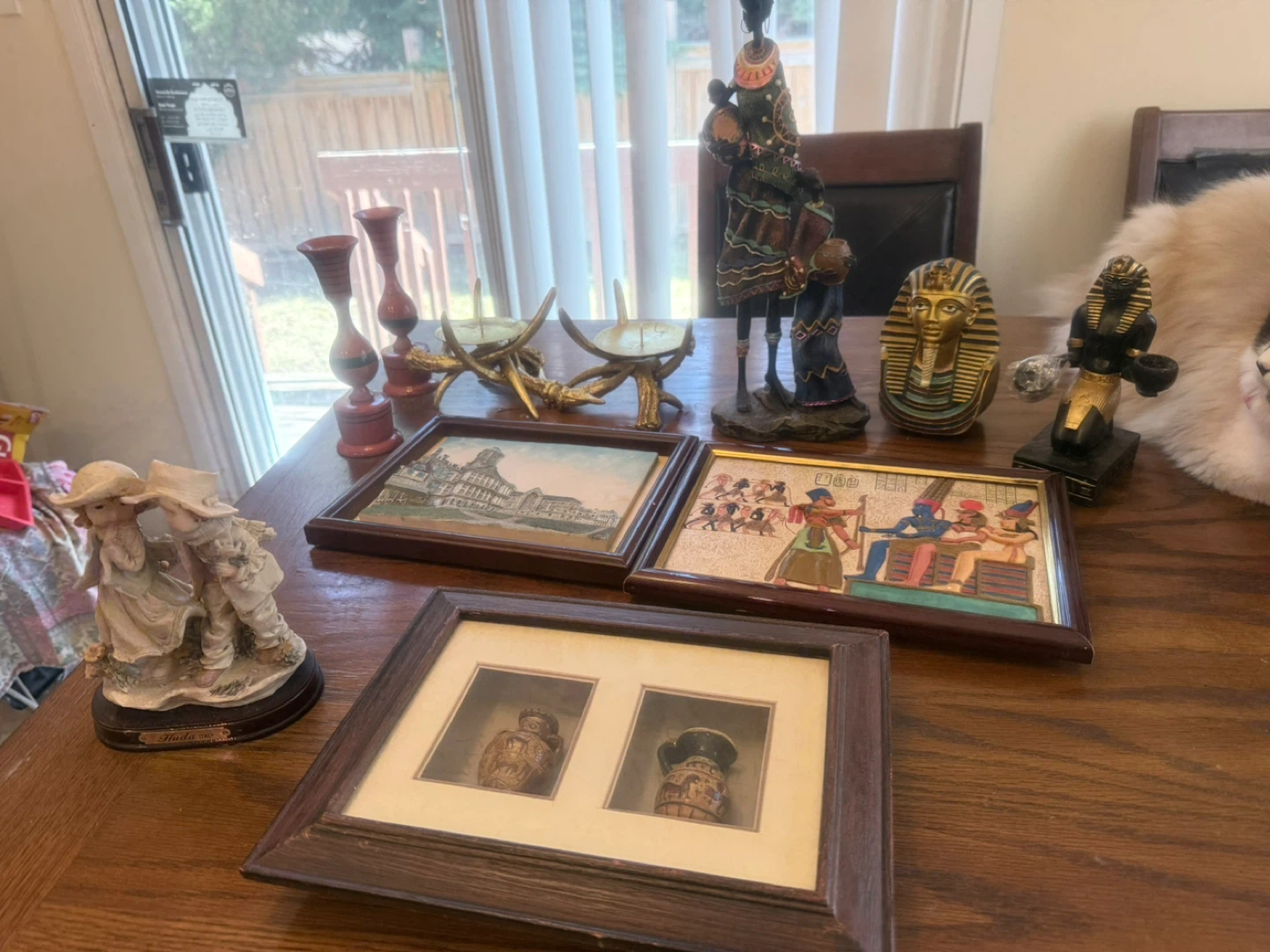 Collection of decorative figurines and framed art pieces. Includes Egyptian-themed busts, a tribal figure, and framed historical scenes. Also features a pair of vintage-style children figurines, marked 'Hada Italy'. These items add a unique touch to any decor.
