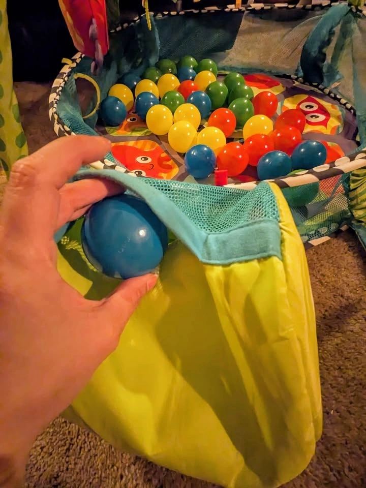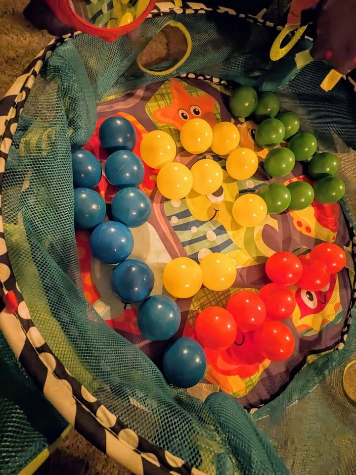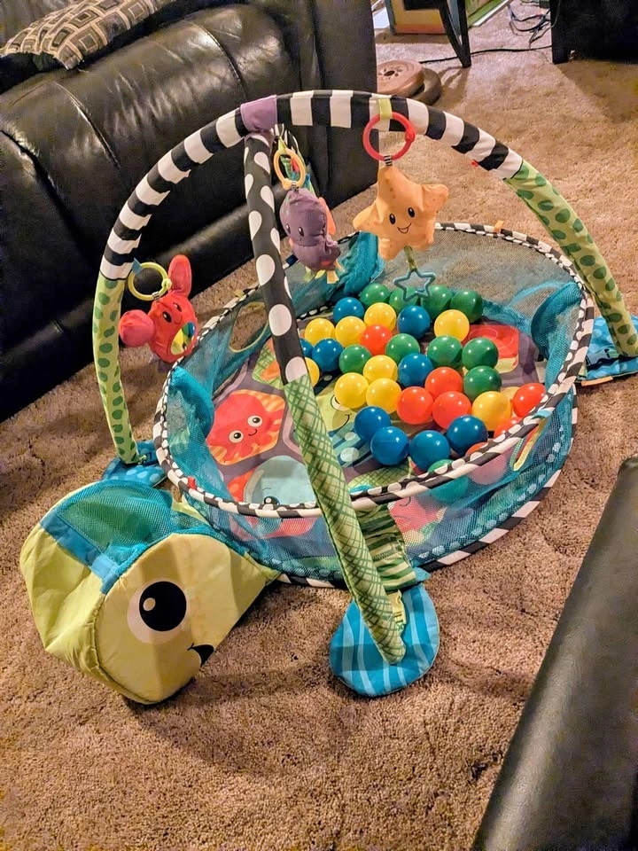 Adorable turtle perfect from newborn to toddler. Converts from play mat to ball pit with removable arches and multi texture, BPA free toys. Easy ball storage inside the turtle's head and easy to use clips to transform from gym to ball pit. Missing a few balls otherwise near perfect condition. Porch pickup and cash preferred.