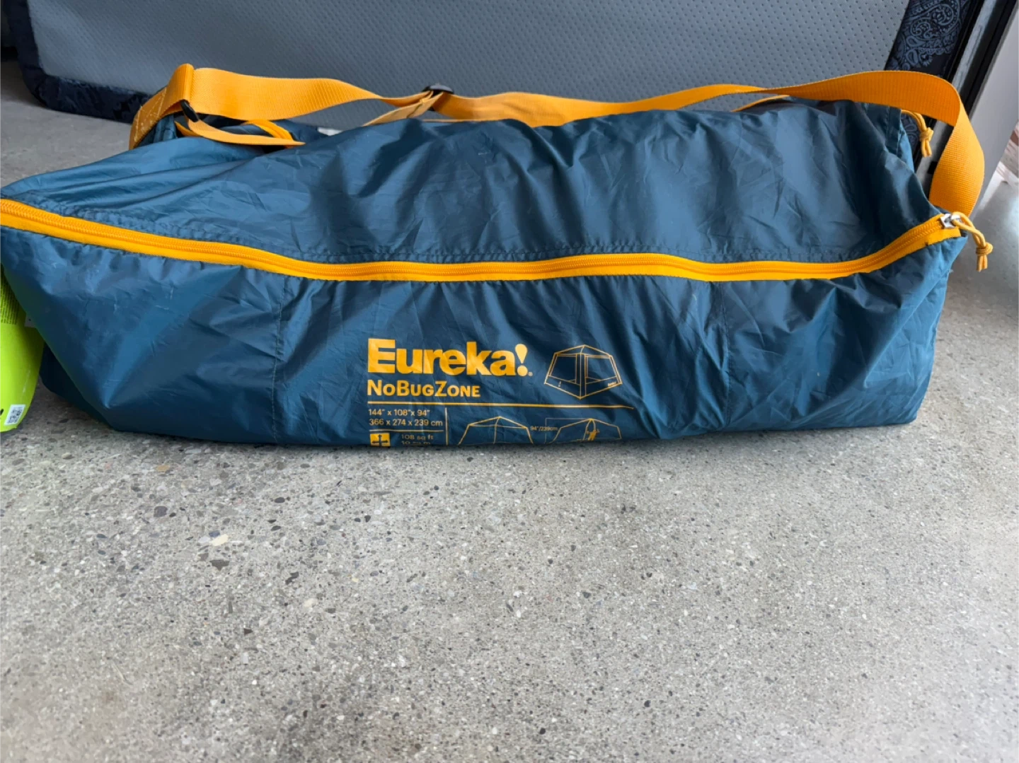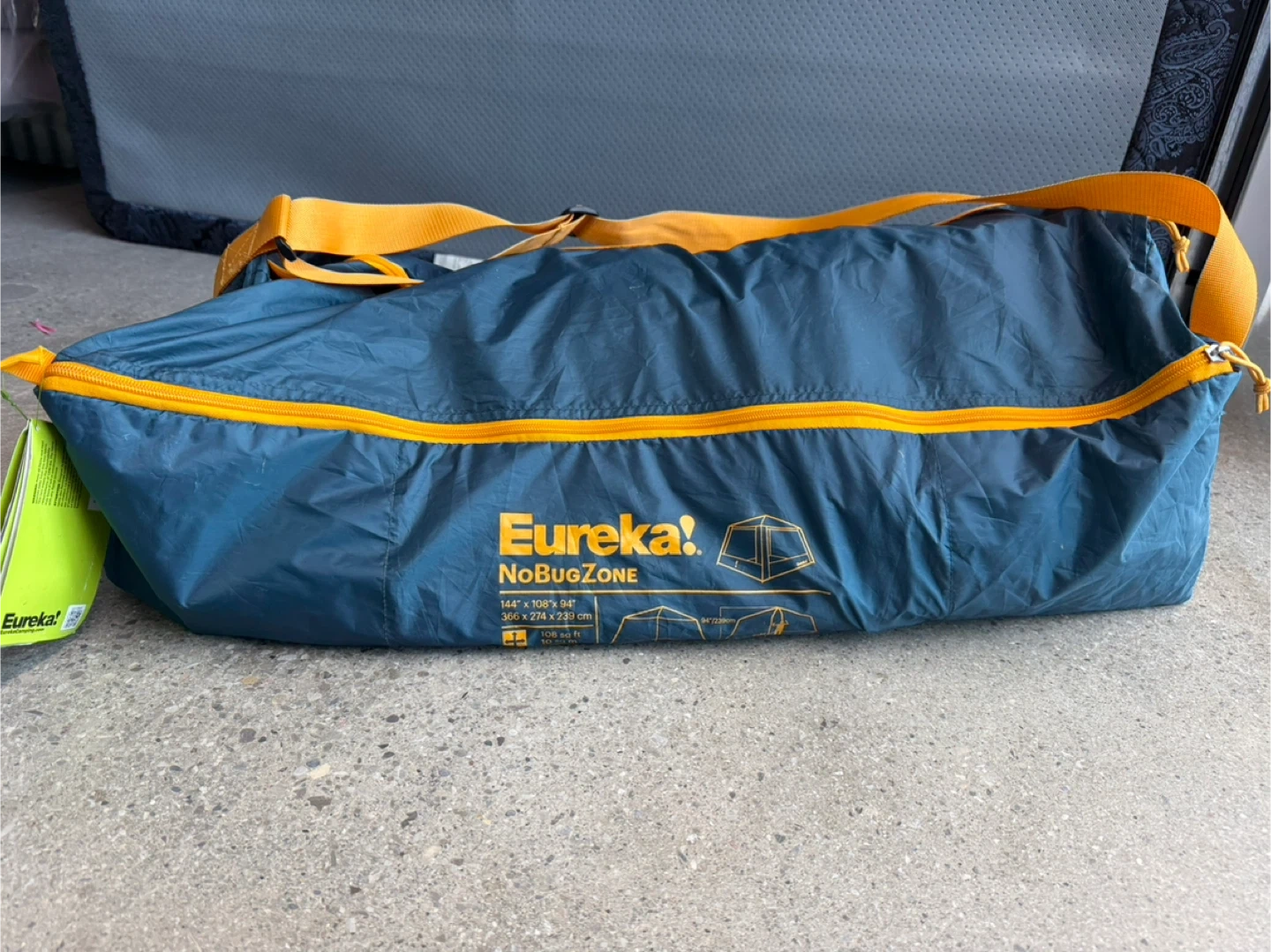 Eureka! NoBugZone tent with stakes and poles included. It's stored in its original carry bag for easy transport. This tent is 144" x 108" and offers 120 sq ft of space.