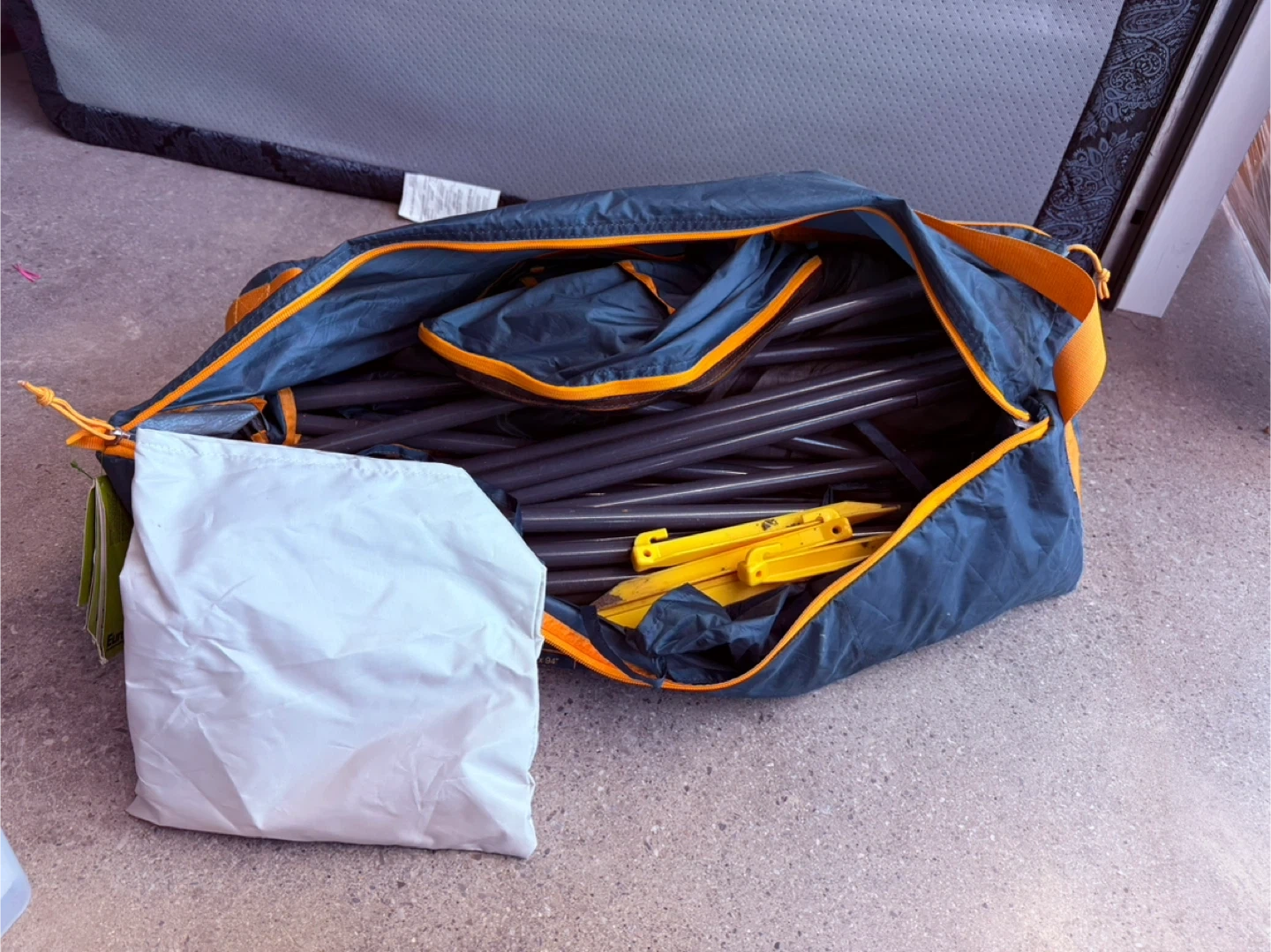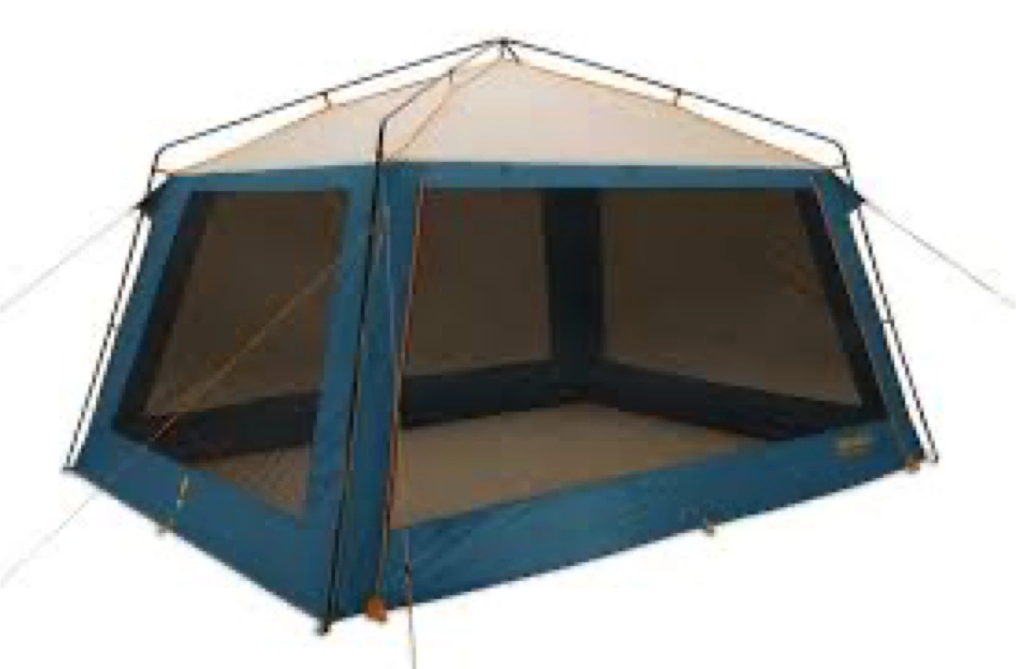 Eureka! NoBugZone tent with stakes and poles included. It's stored in its original carry bag for easy transport. This tent is 144" x 108" and offers 120 sq ft of space.