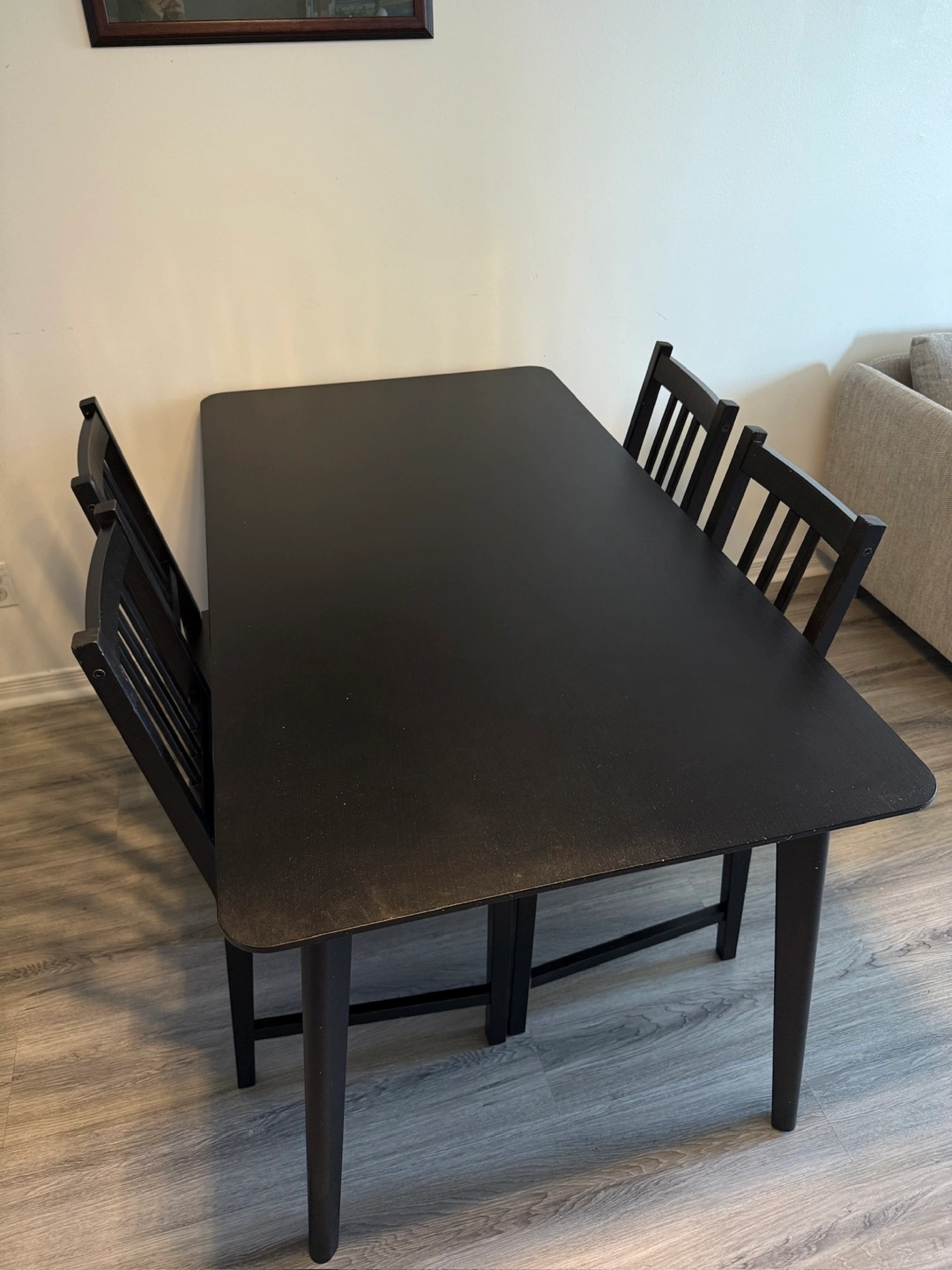 Selling a black dining table with four matching chairs! It's in great shape and ready for a new home. Perfect for small to medium spaces or cozy dining rooms