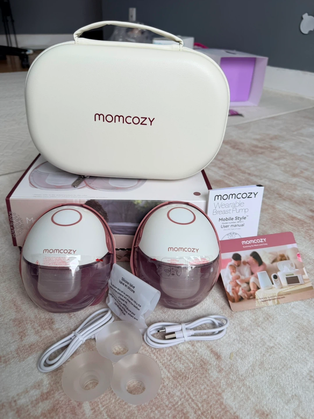This Momcozy wearable breast pump comes in a carrying case. It includes two pumps, charging cables, and silicone valves. The pumps are pink and white.