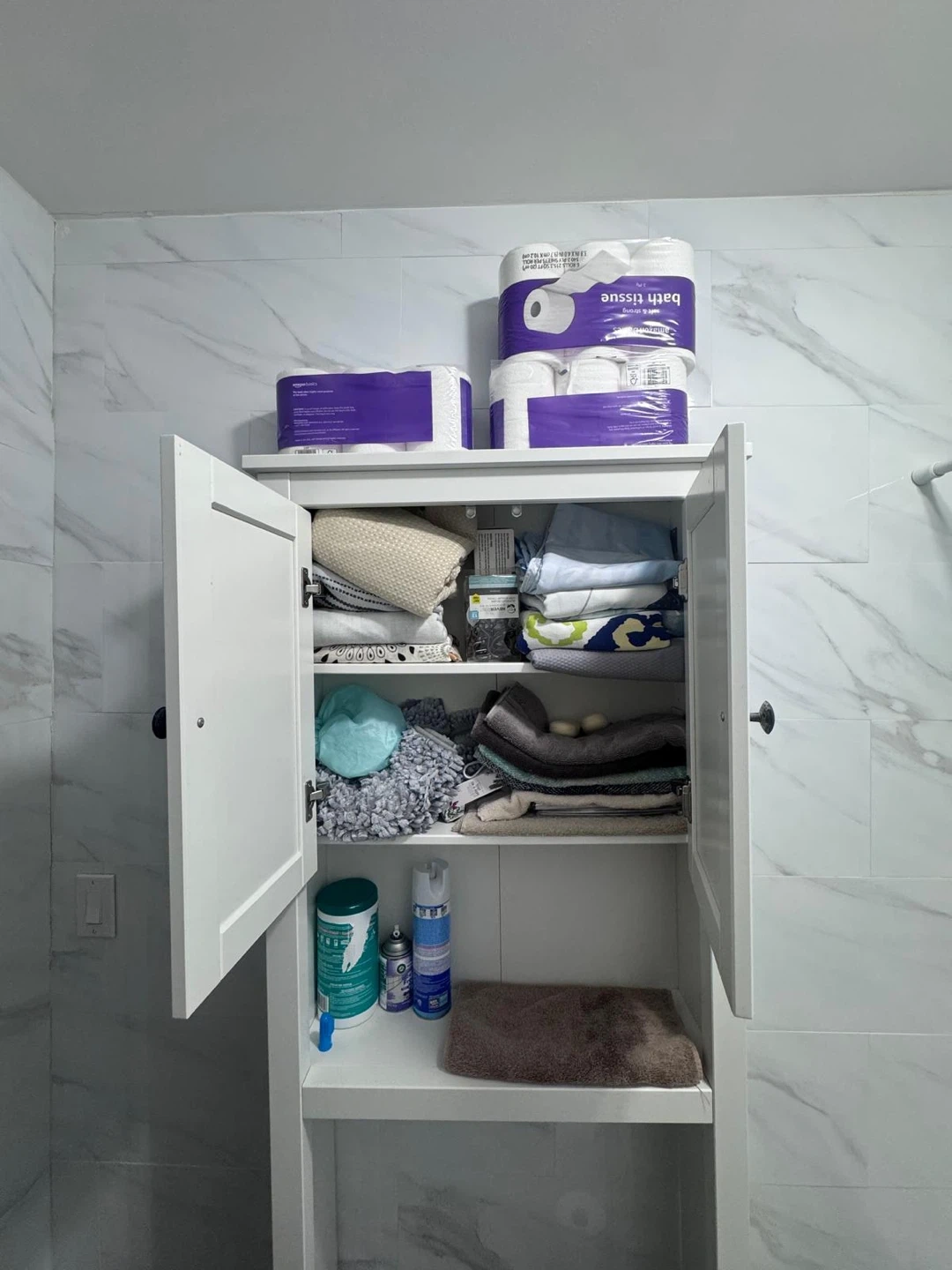 This white bathroom storage cabinet offers ample space for your essentials. It features two doors at the top and an open shelf below. Perfect for organizing towels, toiletries, and other bathroom items!
