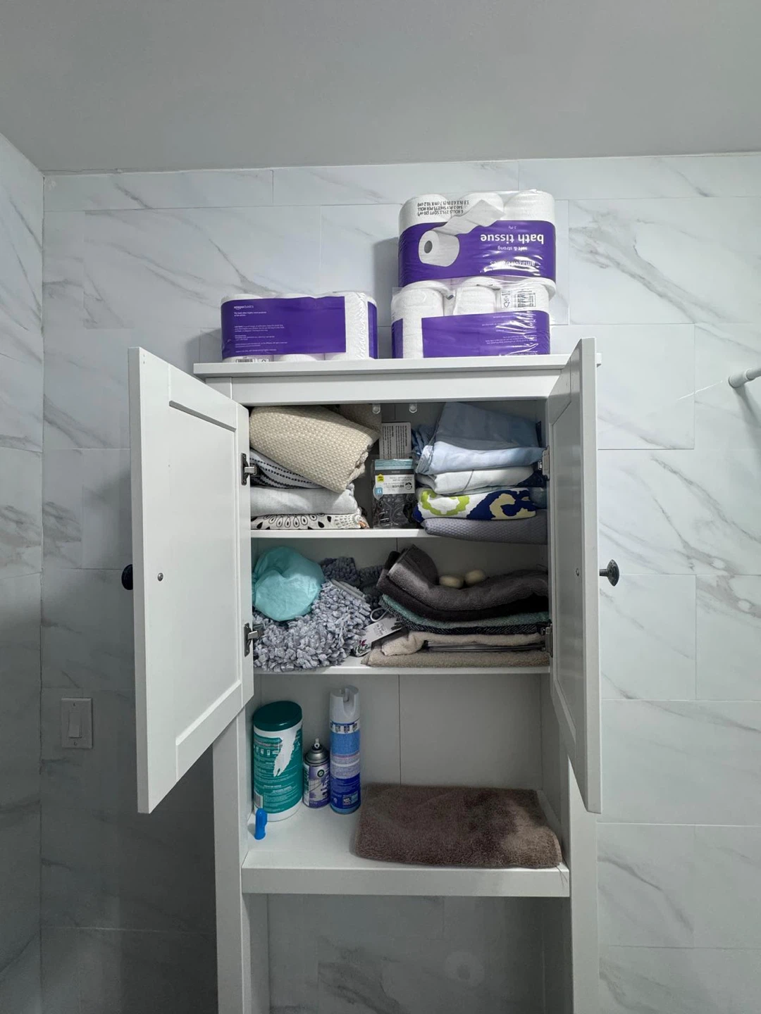 This white bathroom storage cabinet offers ample space for your essentials. It features two doors at the top and an open shelf below. Perfect for organizing towels, toiletries, and other bathroom items!
