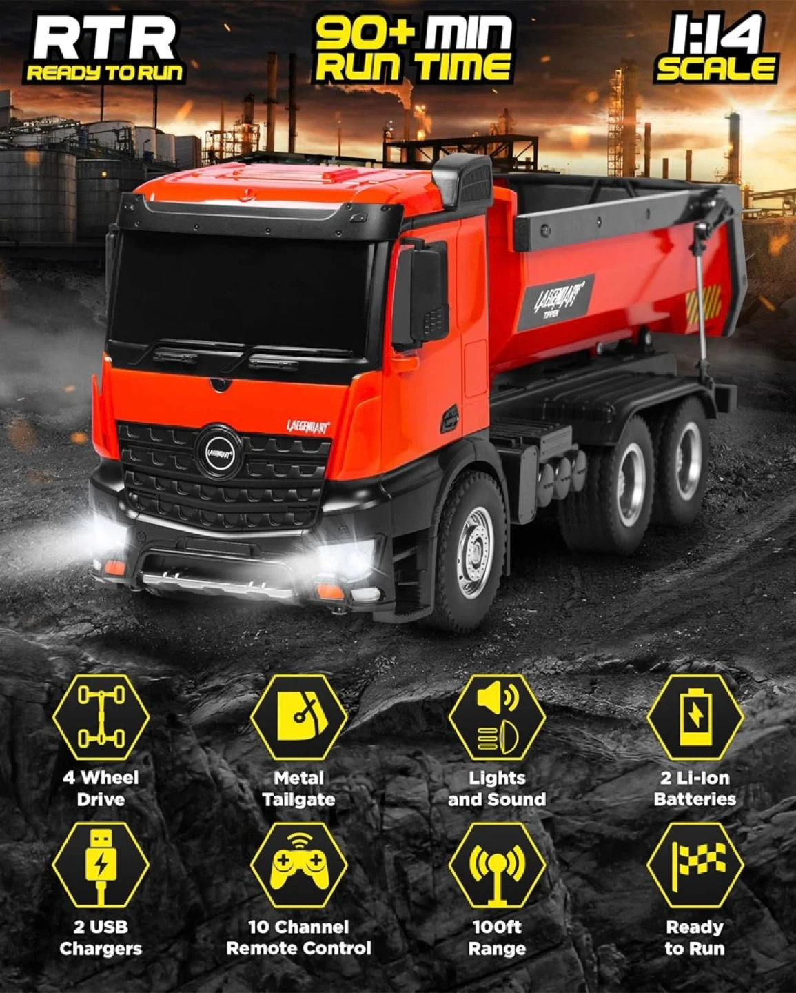 LAEGENDARY RC Tipper Truck in orange and black. Features 4-wheel drive, a metal tailgate, and lights with sound. Includes two 600mAh Li-ion batteries, two USB chargers, and a 10 channel remote control. It's 1:14 scale and has a 100ft range. This RC truck offers over 90 minutes of run time!
