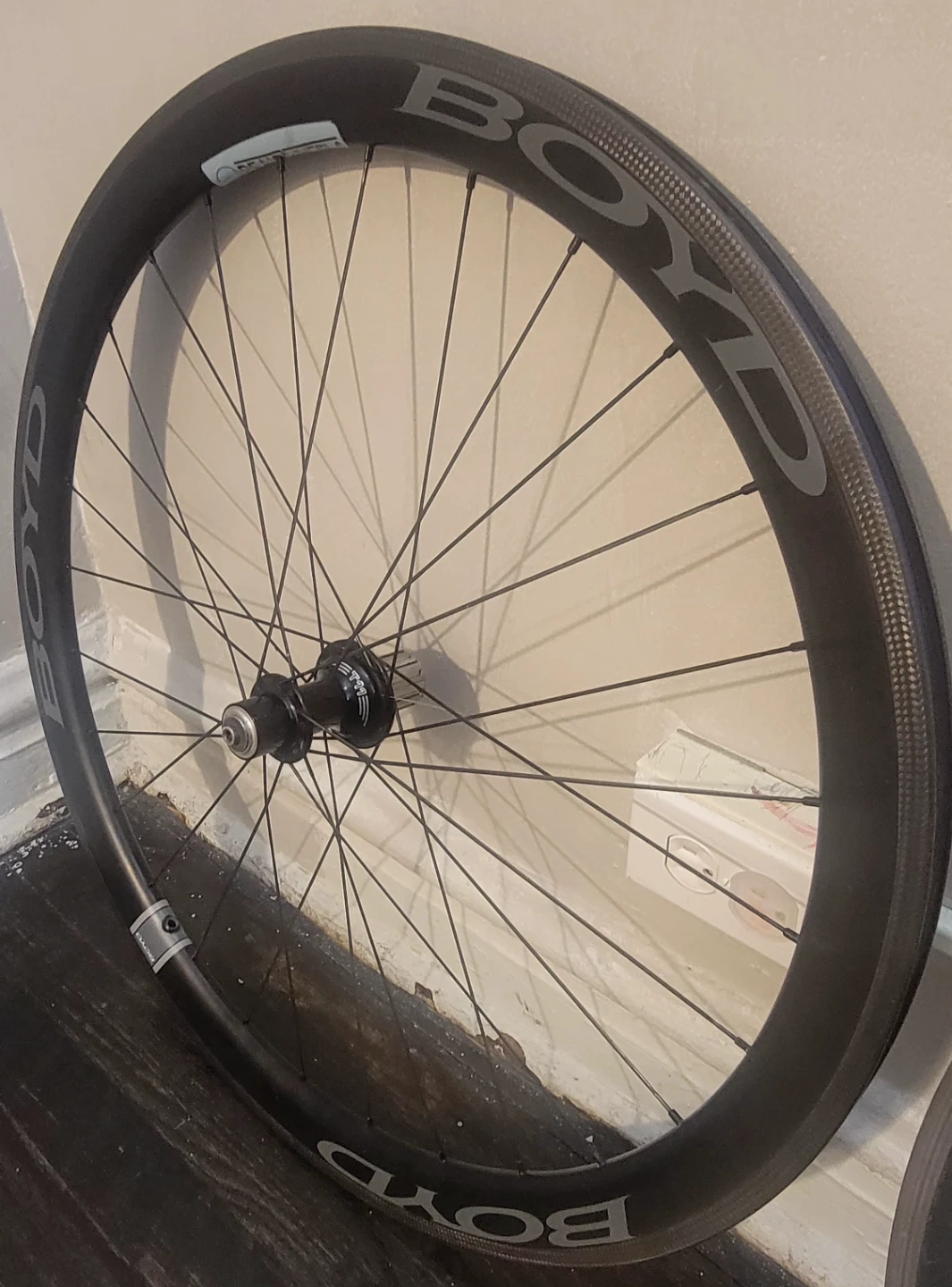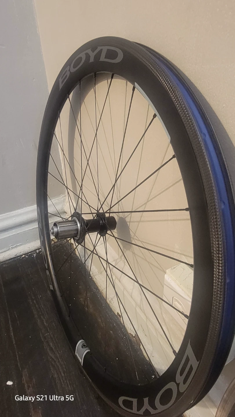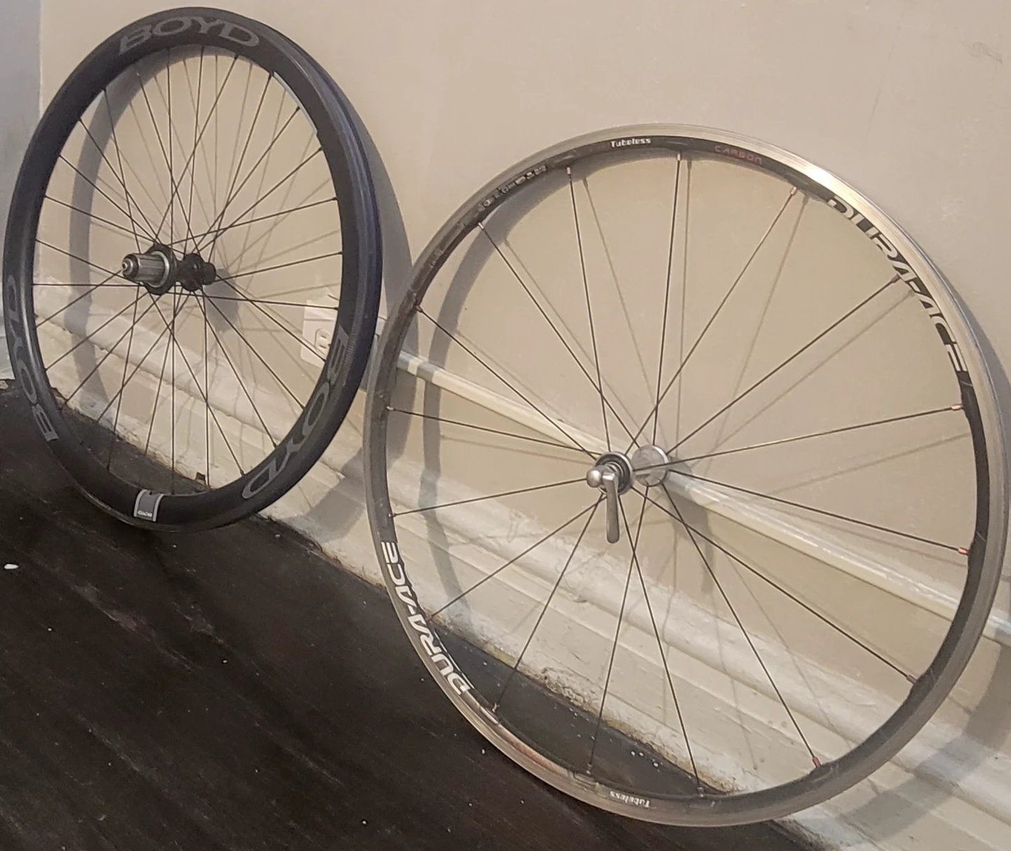 You have a high-end wheelset with a DURA-ACE front wheel and a Boyd 11-speed, 40mm rear wheel. The carbon tubular frame on the front wheel is lightweight and optimized for speed. The Boyd rear wheel offers a wide range of gears with its 11-speed cassette, making it suitable for various terrain and riding styles. Overall, your wheelset seems to be designed for performance and efficiency.