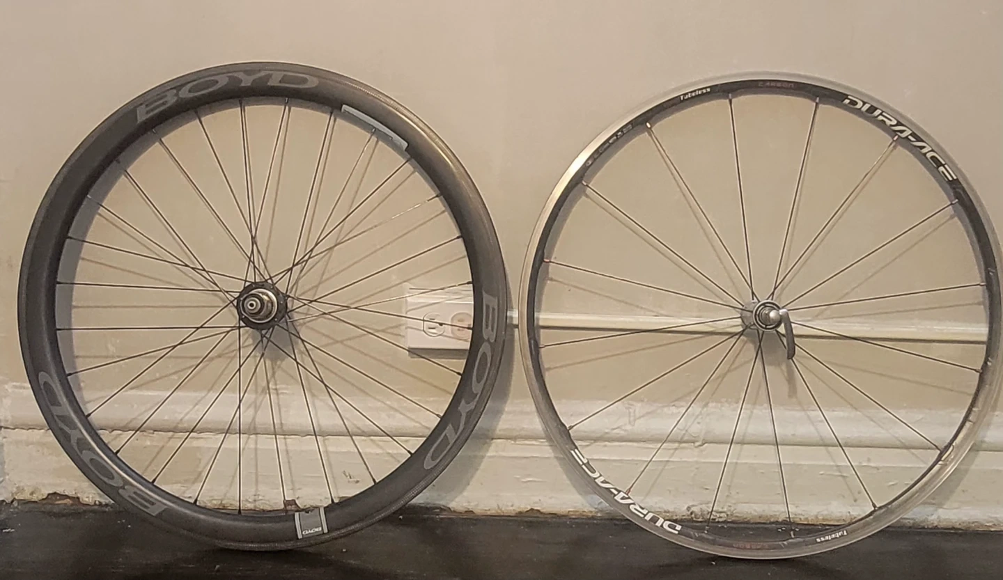 You have a high-end wheelset with a DURA-ACE front wheel and a Boyd 11-speed, 40mm rear wheel. The carbon tubular frame on the front wheel is lightweight and optimized for speed. The Boyd rear wheel offers a wide range of gears with its 11-speed cassette, making it suitable for various terrain and riding styles. Overall, your wheelset seems to be designed for performance and efficiency.