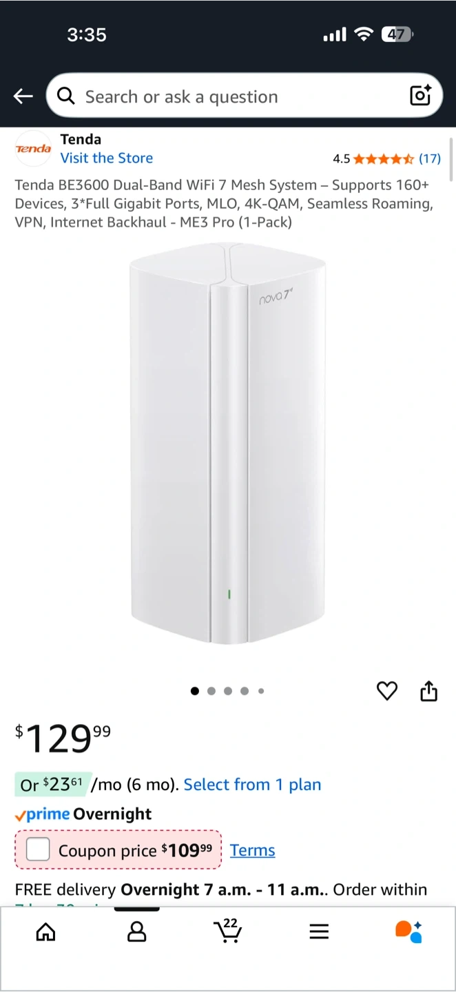 It's the ME3 Pro (1-pack) and offers high-performance BE3600 Mesh Wi-Fi 7. Provides reliable whole-home coverage for up to 2500 sq.ft, perfect for 2-3 bedroom houses. It supports 160+ devices and has 3 full Gigabit ports. Comes with easy setup, Ethernet backhaul, VPN, intelligent diagnosis, and parental controls. The original price is $129.99 and it's still in its box!
