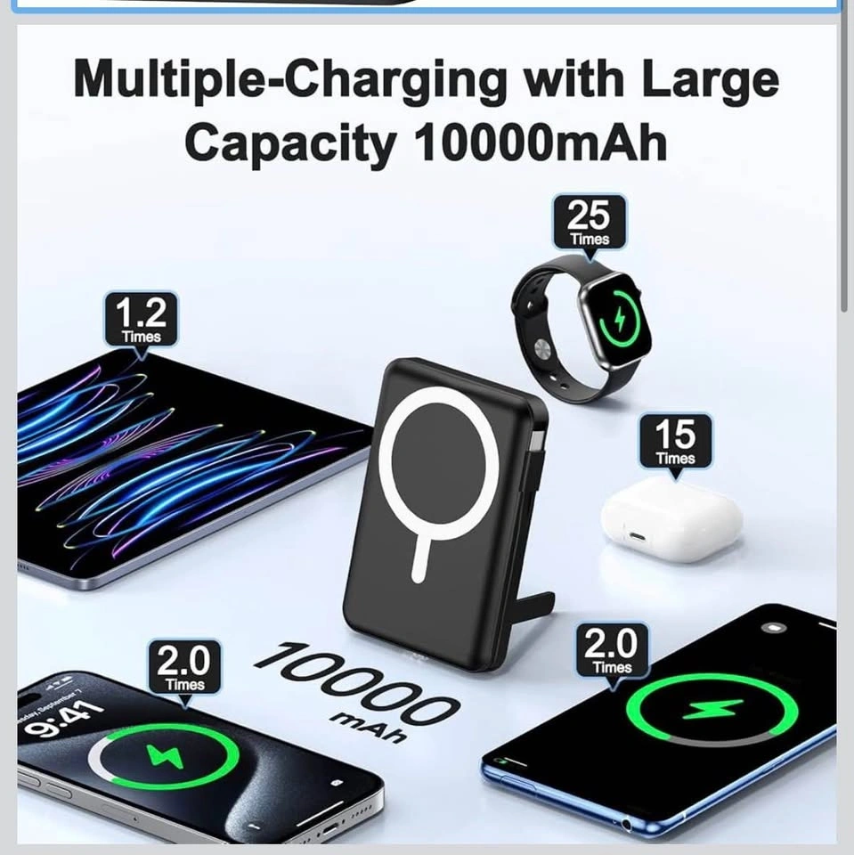High-capacity 10000mAh wireless portable charger that can charge 6 devices simultaneously. Has USB-A and USB-C outputs and a built-in cable. Compatible with Apple Watch models. Can charge devices like smartphones, tablets, and earbuds. Has a digital display showing battery level.