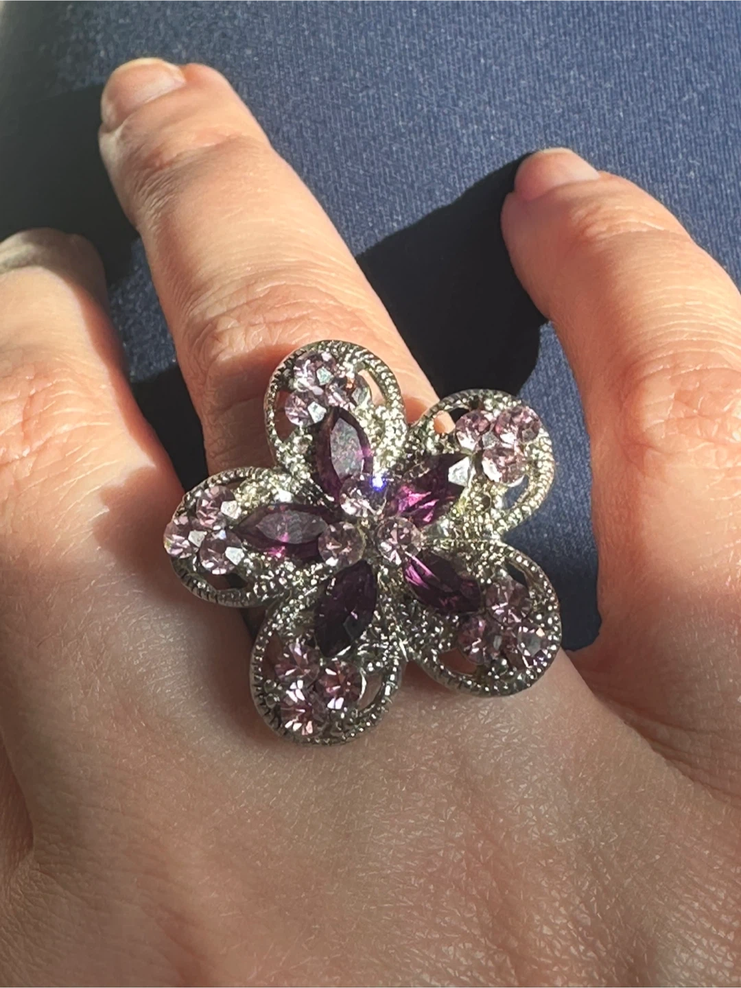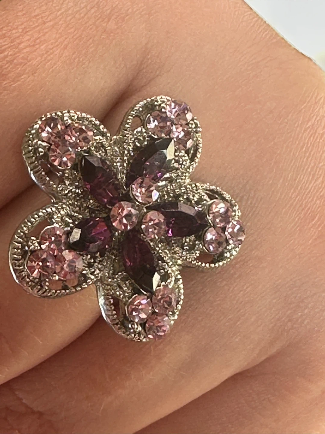 This statement ring features a delicate flower design with sparkling purple and pink crystals.