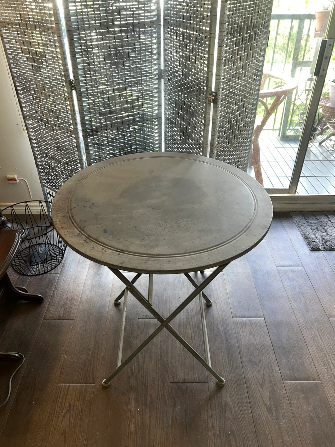 Small round table. Metal frame and top. Foldable legs. Grey colour. Some staining on tabletop. Some rust spots that I imagine can be removed with vinegar or chemical. 27.5 inches wide 29.5 inches tall
