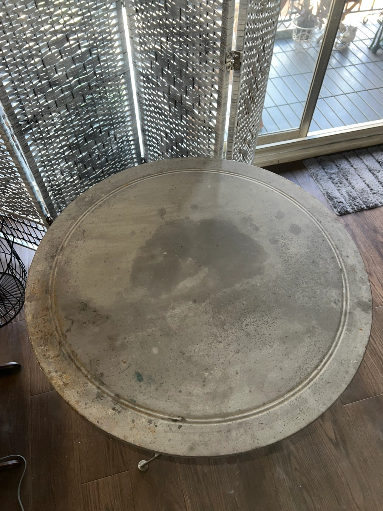 Small round table. Metal frame and top. Foldable legs. Grey colour. Some staining on tabletop. Some rust spots that I imagine can be removed with vinegar or chemical. 27.5 inches wide 29.5 inches tall