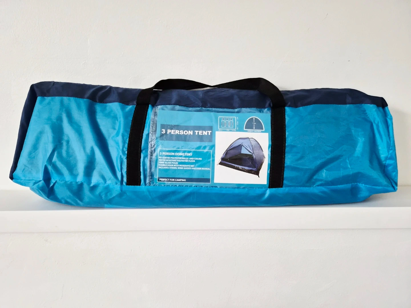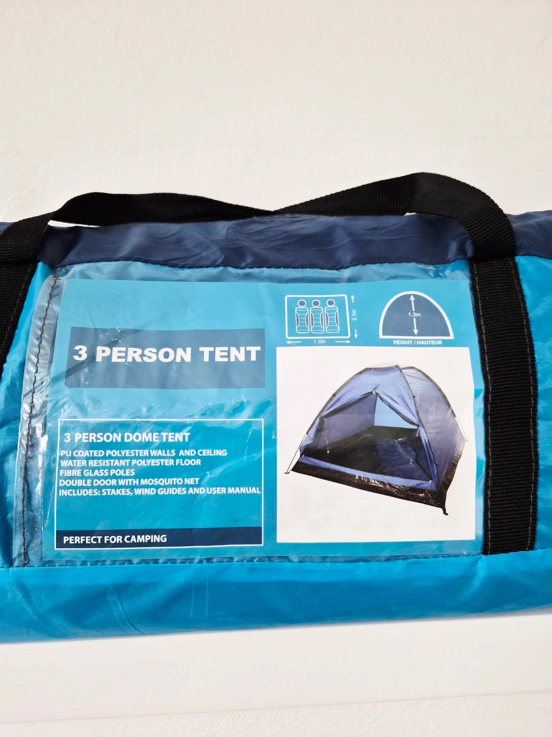 3 person dome tent. PU coated polyester walls and ceiling with water-resistant polyester floor. Double door with mosquito net. Includes stakes, wind guards and user manual. Perfect for camping!