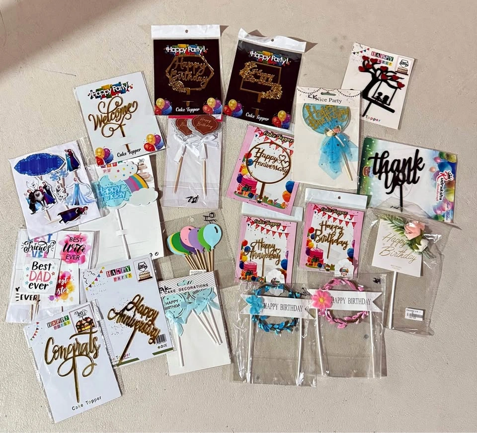 10All new and packed cake toppers for birthday/anniversary/thank you/congrats. Some have one piece per packet, some have multiple pieces. 15 single pieces per pack.