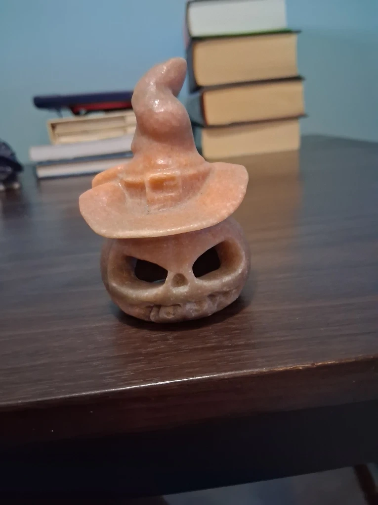 570Here's a pumpkin wearing a witch hat figurine! It's in great shape and would be a fun addition to your Halloween decor. It isn't only for Halloween can be used year around. I'm not sure if it's calcite or aventurine as my identification app is confused and I cannot remember. The piece is hallow so if you have a light to put under it, it looks pretty spooky. Check the pictures to see with light.