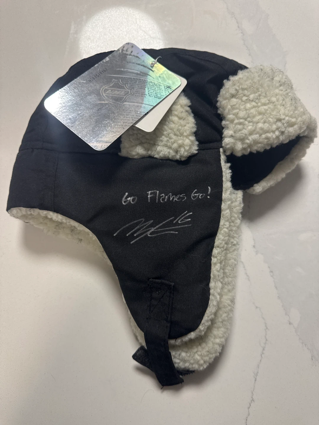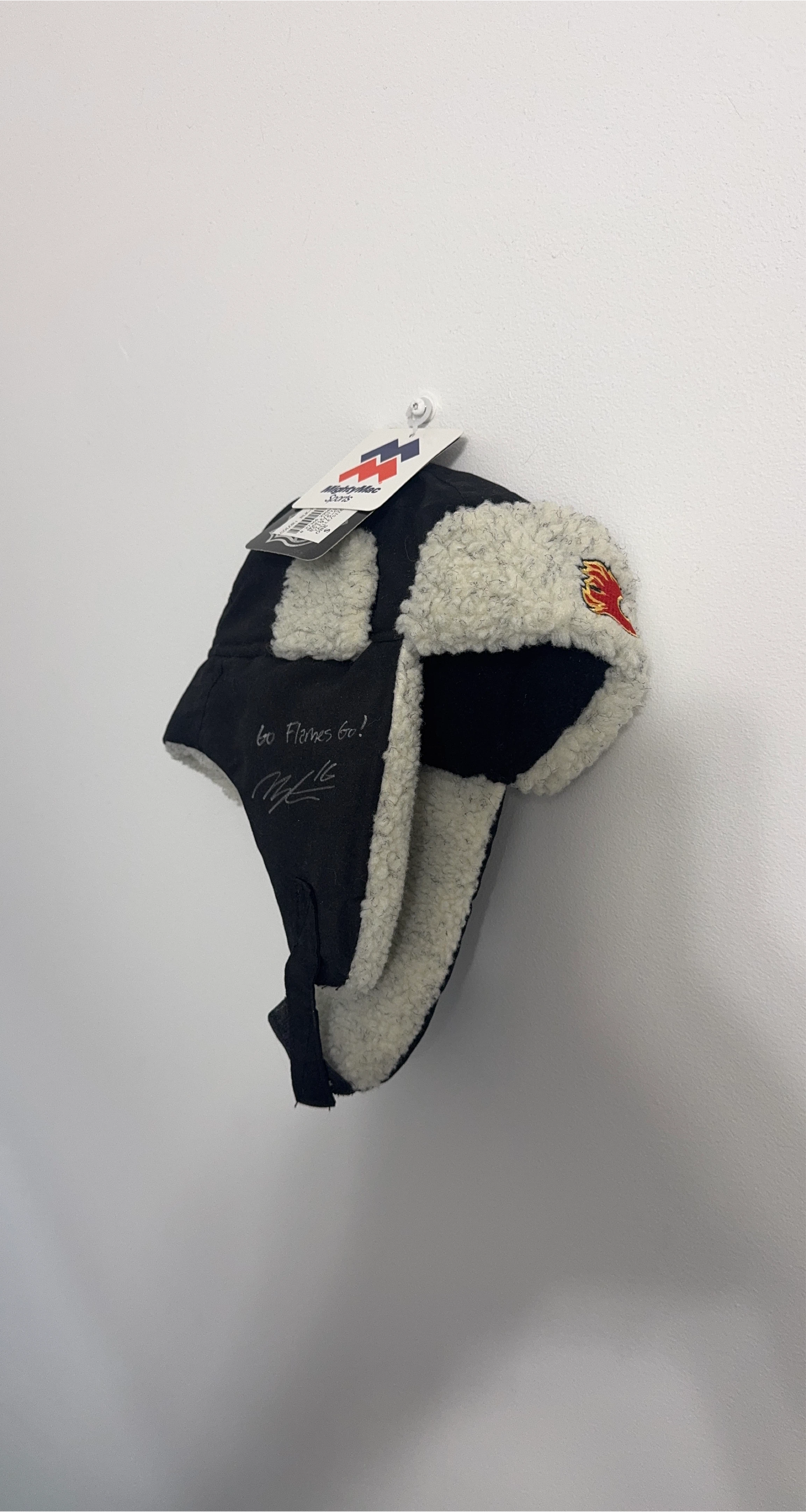Cozy Mighty Max Calgary Flames trapper hat to keep you warm during those cold winter nights! It features the Flames logo and is in great condition. This Hat is Autographed and Inscribed “Go Flames Go” Perfect for any Flames fan! 1 size 4-6x