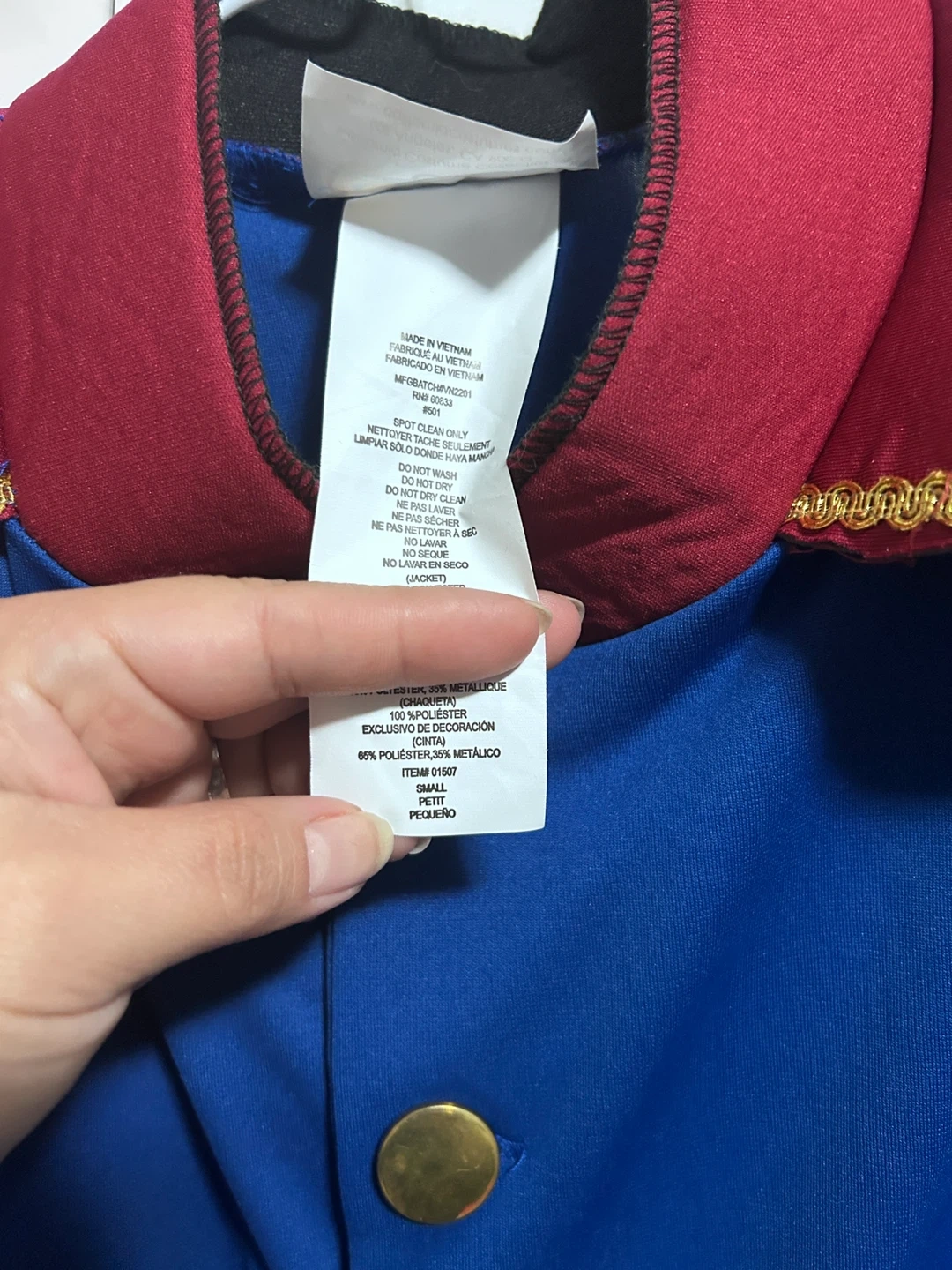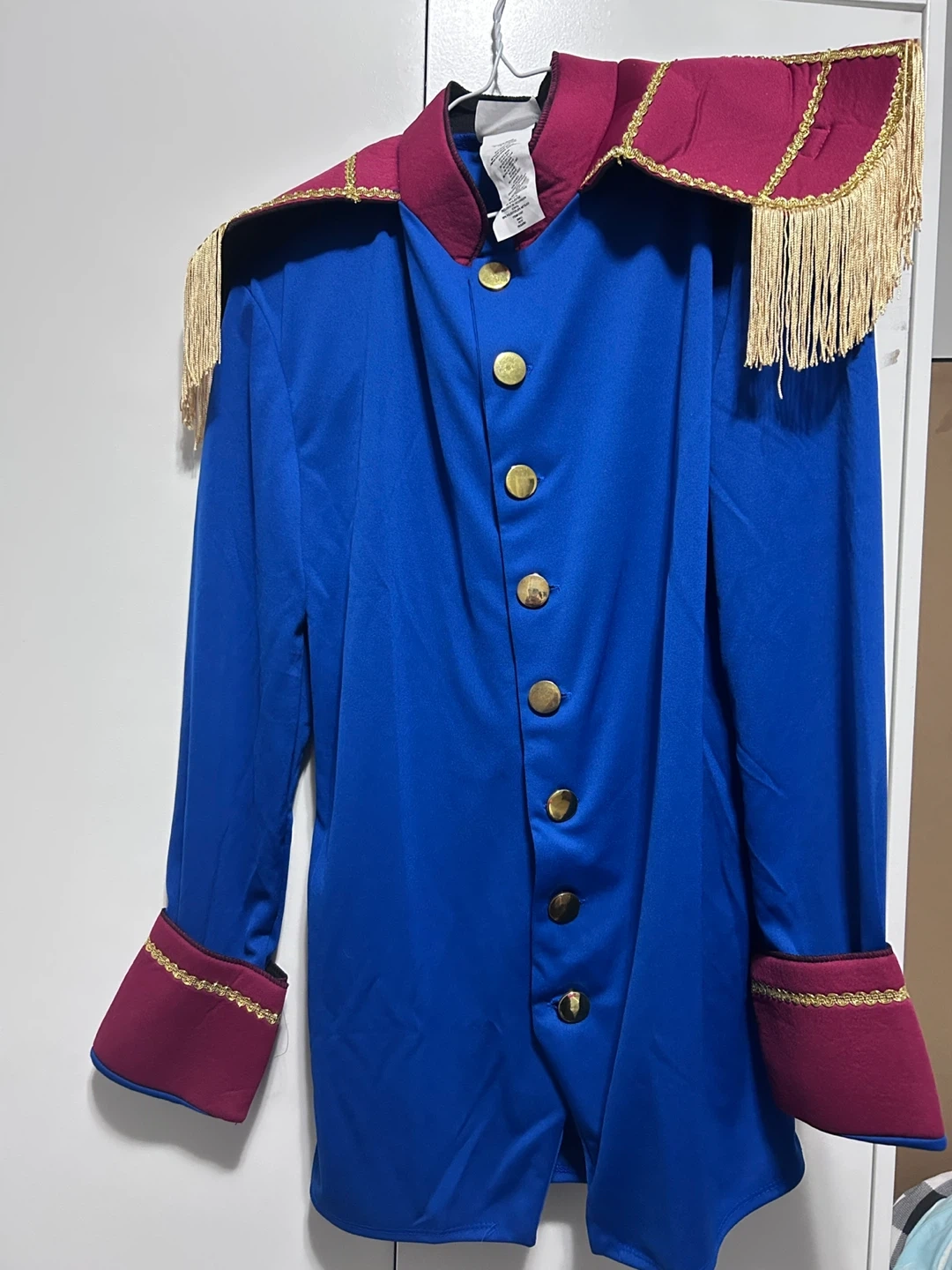 10Here's a Storybook Prince costume from California Costumes, perfect for Halloween or costume parties! It's a size small and includes the jacket, belt, gloves, and sash. The costume is made of polyester and metallic fabric.