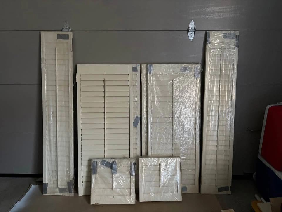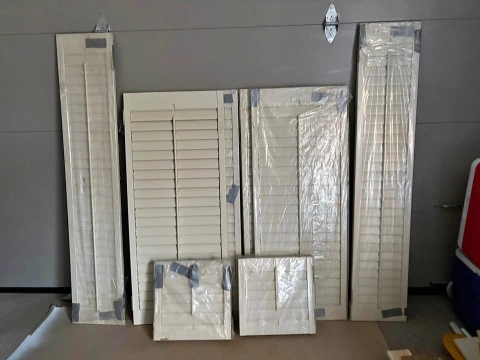 10Quality California Wood Shutters Bay window. (2) 53”x 21” (2) 53”x22” 2 sidelights 63”x 12” 4 transom shutters over front door 16”x16”. $20 or Best Offer!