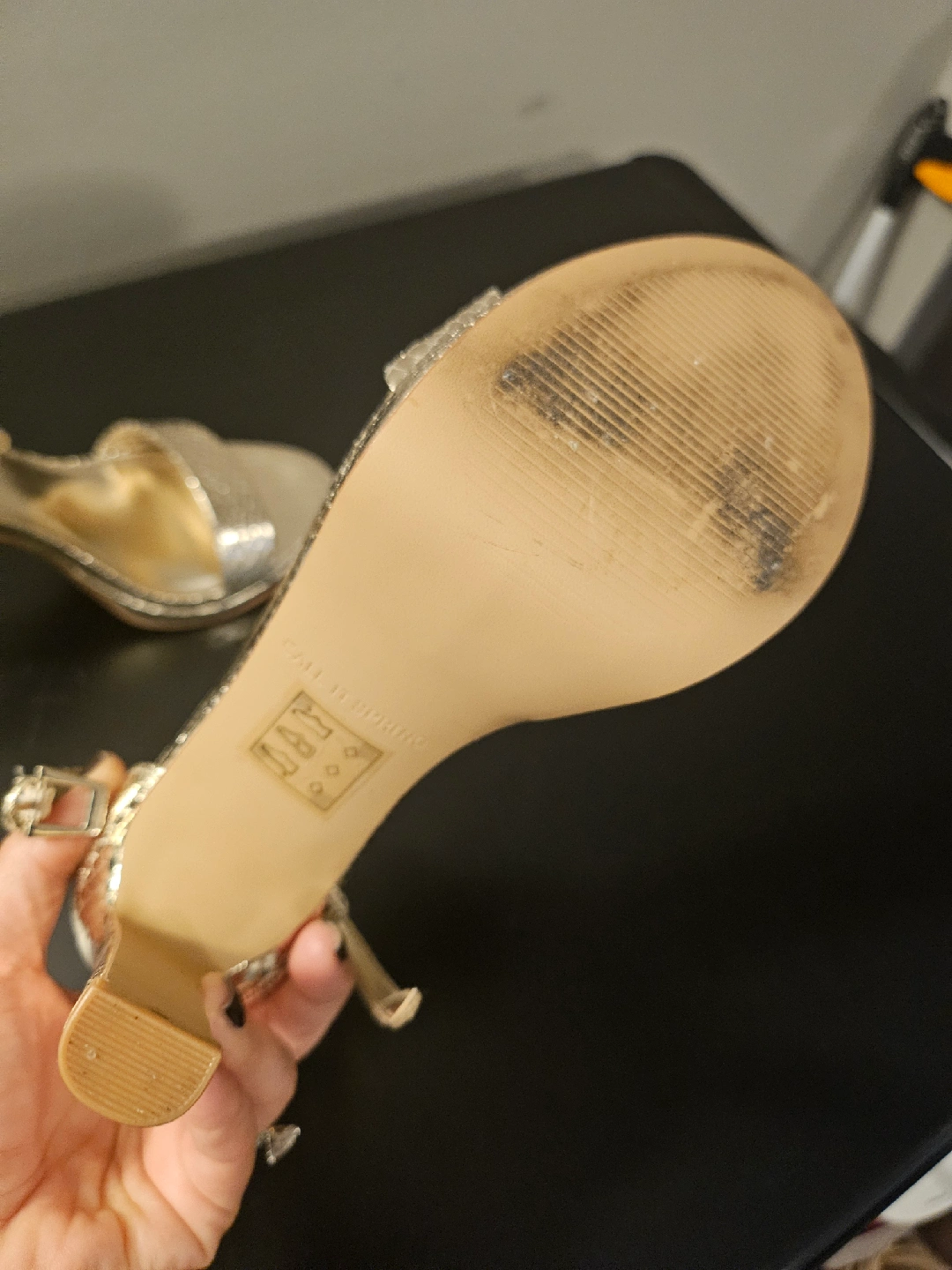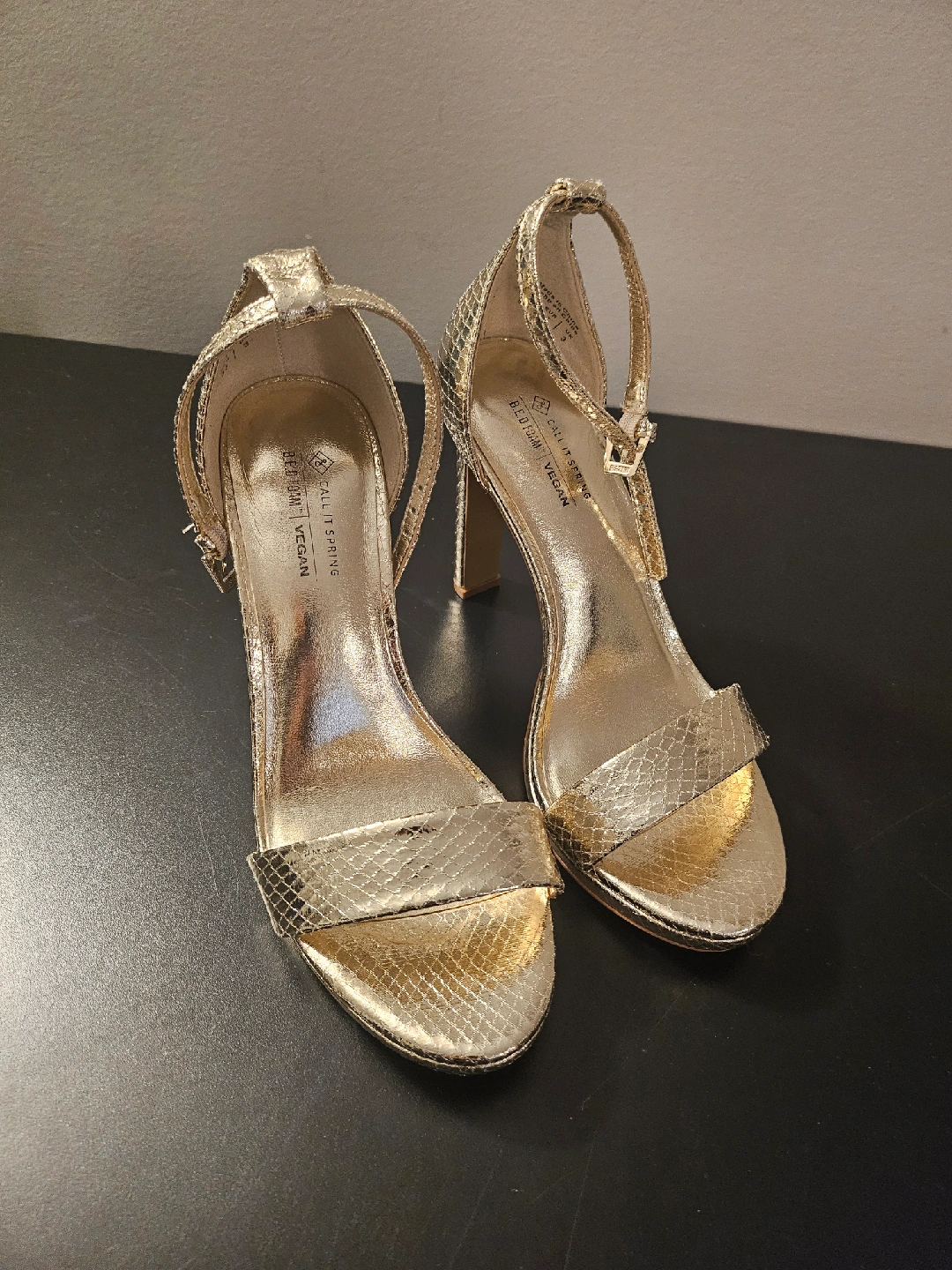 These gold heels from Call It Spring are a stylish addition to any outfit! They are a size 5 and feature a vegan design. worn once for a wedding