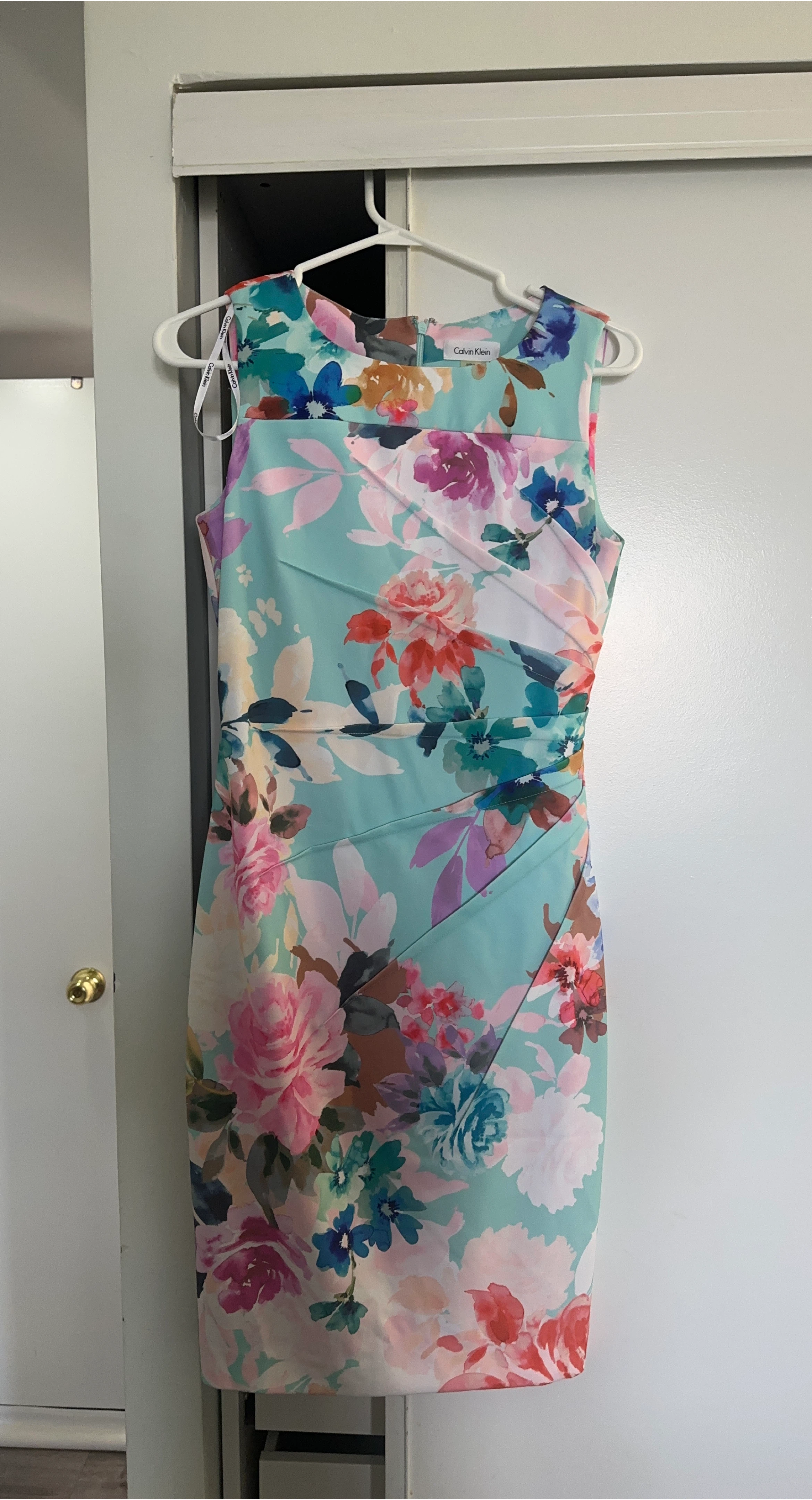 10Selling a lovely Calvin Klein dress with a bright floral print! It's in great condition and perfect for spring or summer events. The dress features a flattering silhouette and is made from a comfortable, lightweight material
