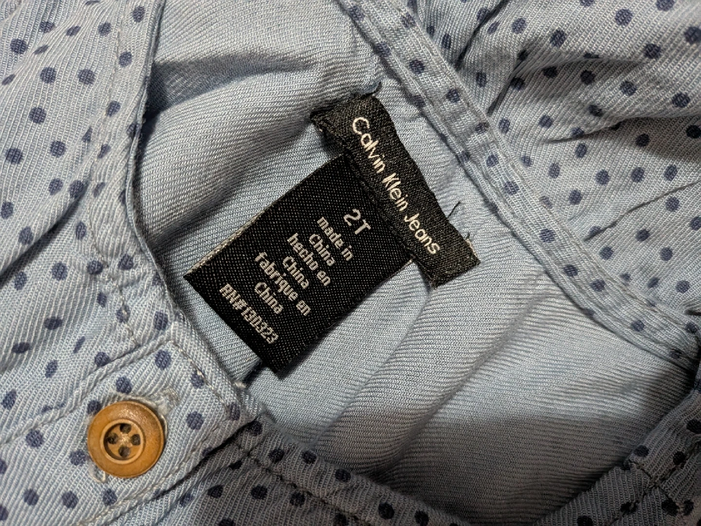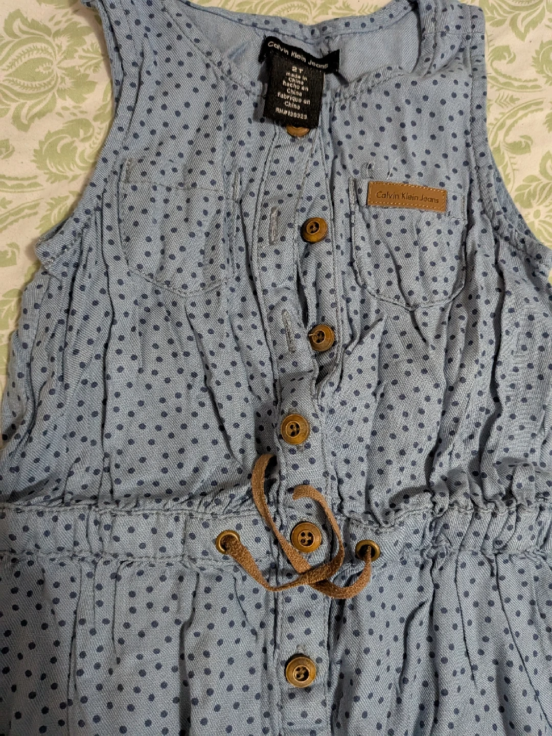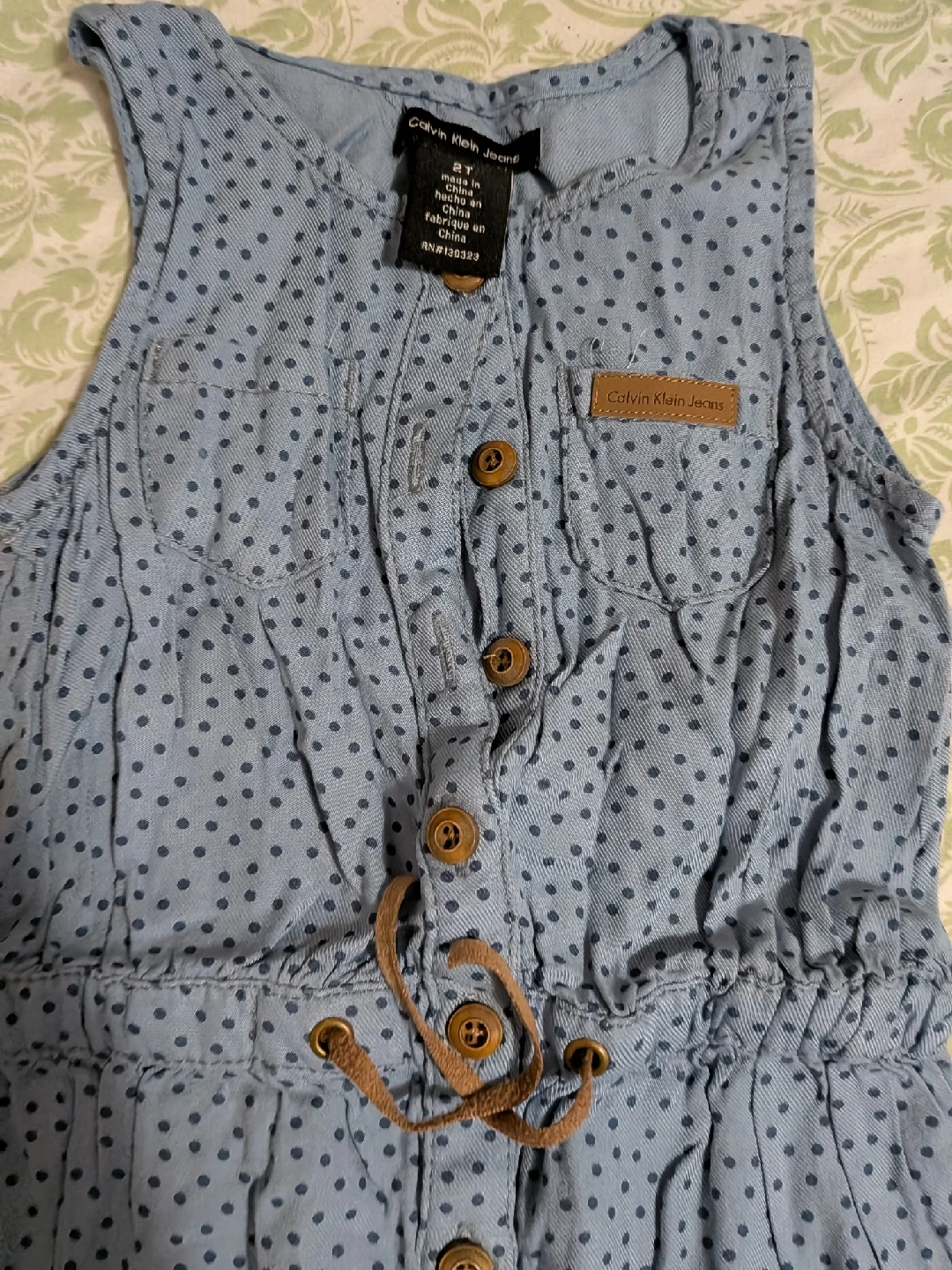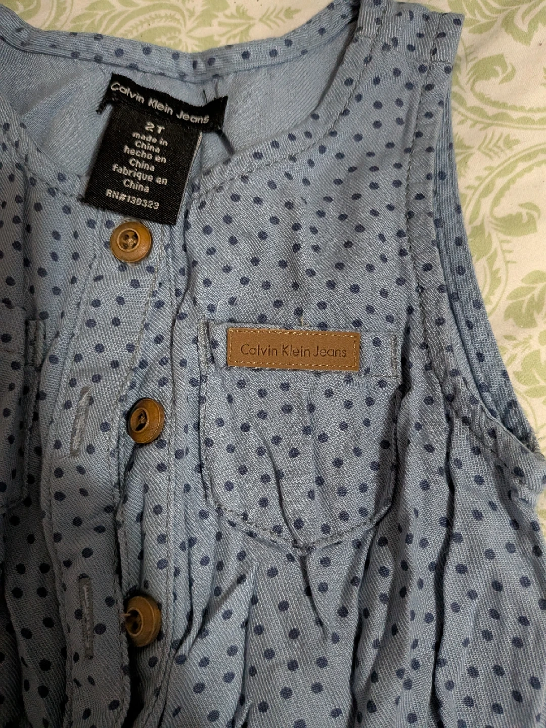 157Cute Calvin Klein Romper jumpsuit for a little one! It's a light blue colour with a subtle polka dot pattern. Size 3T Soft fabric Cash only, No etransfers Location: Etobicoke. Rathburn Rd and Renforth dr. Etobicoke Olympium nearby