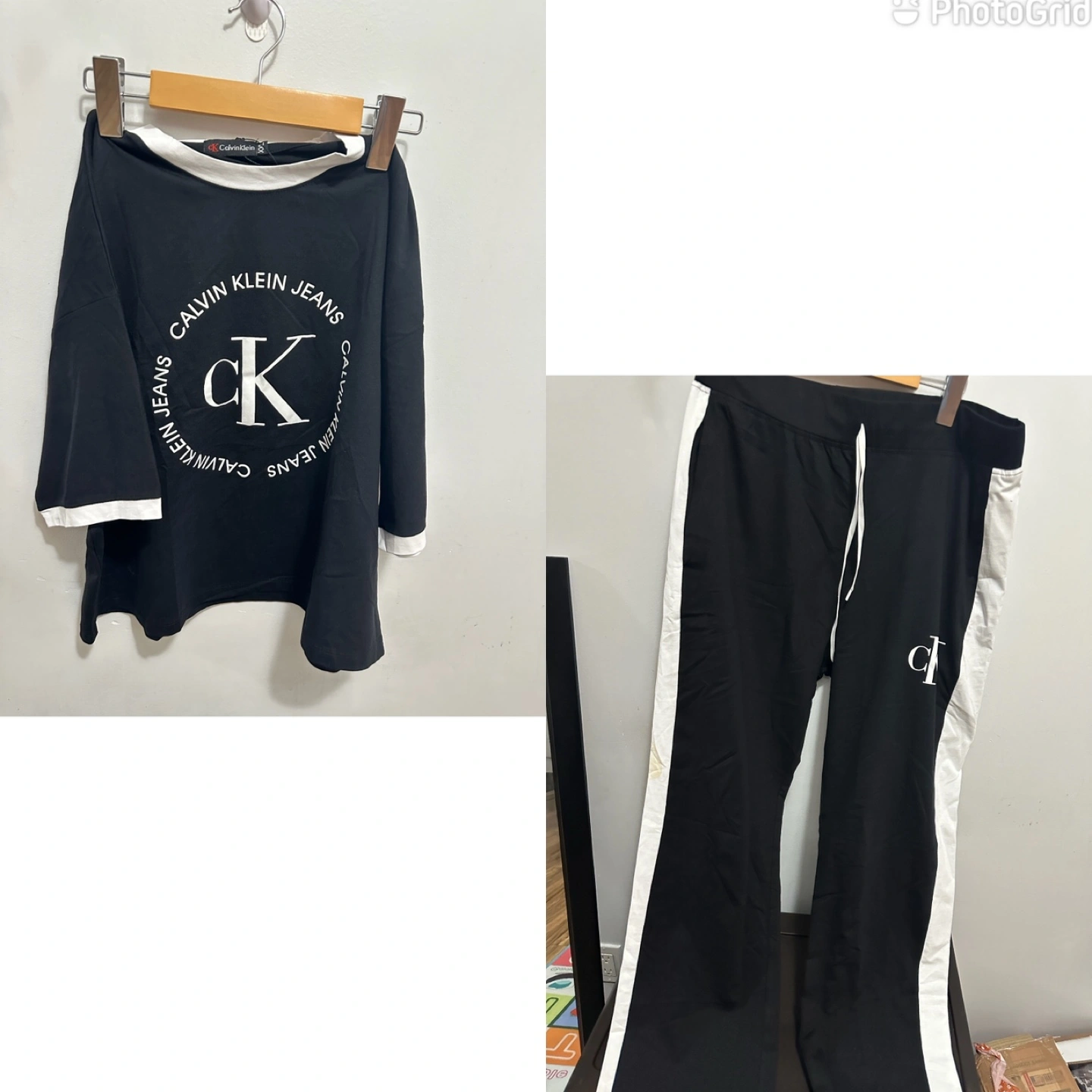 Black Calvin Klein Jeans t-shirt. Features a circular logo. Matching black track pants with white side stripes. Drawstring waist.
