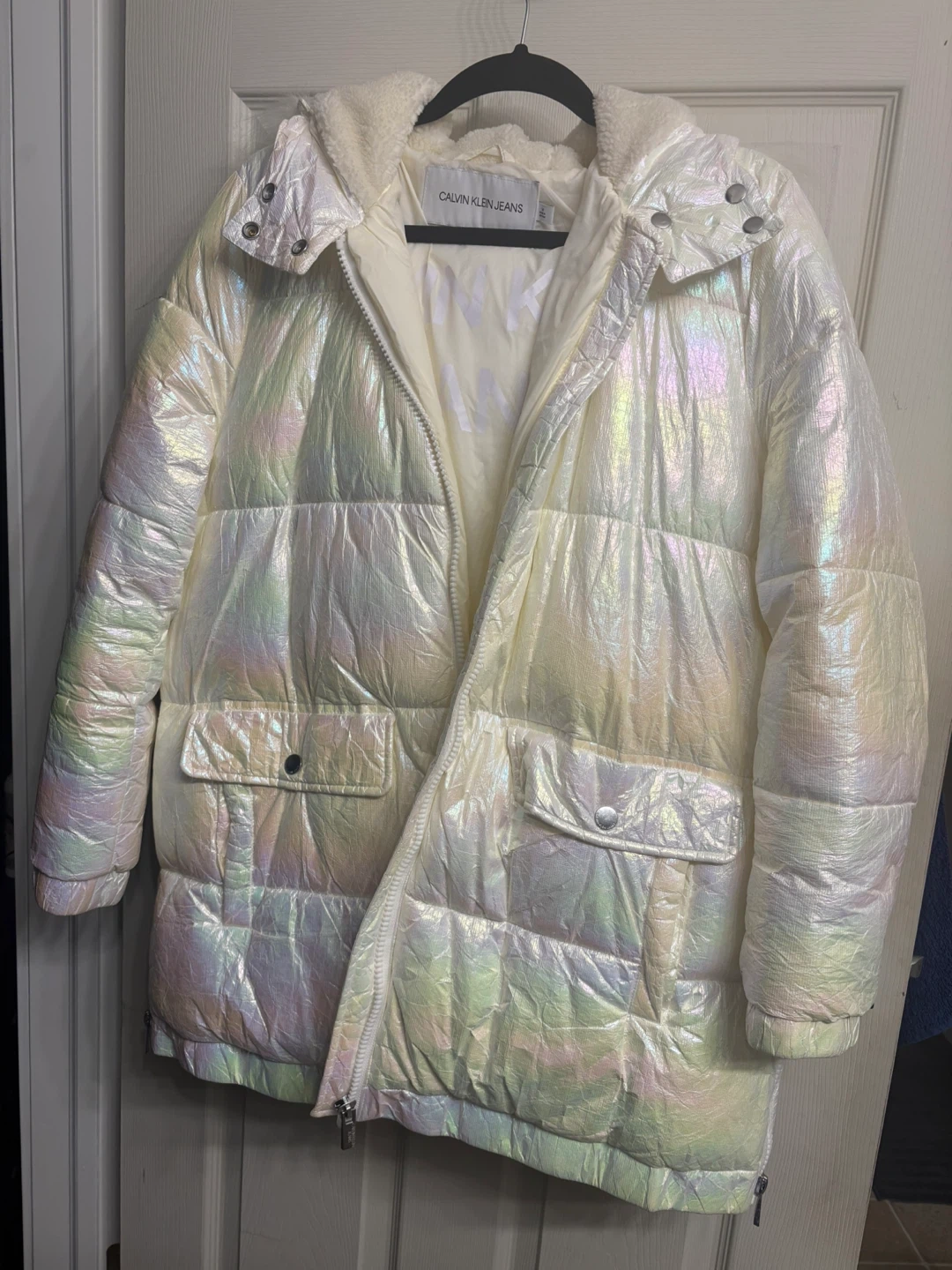 58Calvin Klein Jeans puffer jacket in size medium, a bit oversized, so it fits a large size as well. It's in great condition, used only once! The jacket has a unique iridescent sheen that makes it stand out. Perfect for staying warm and stylish during the colder months. Pick up in Chestermere. If ad is up, it is available.