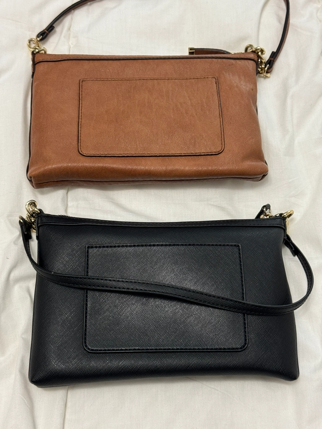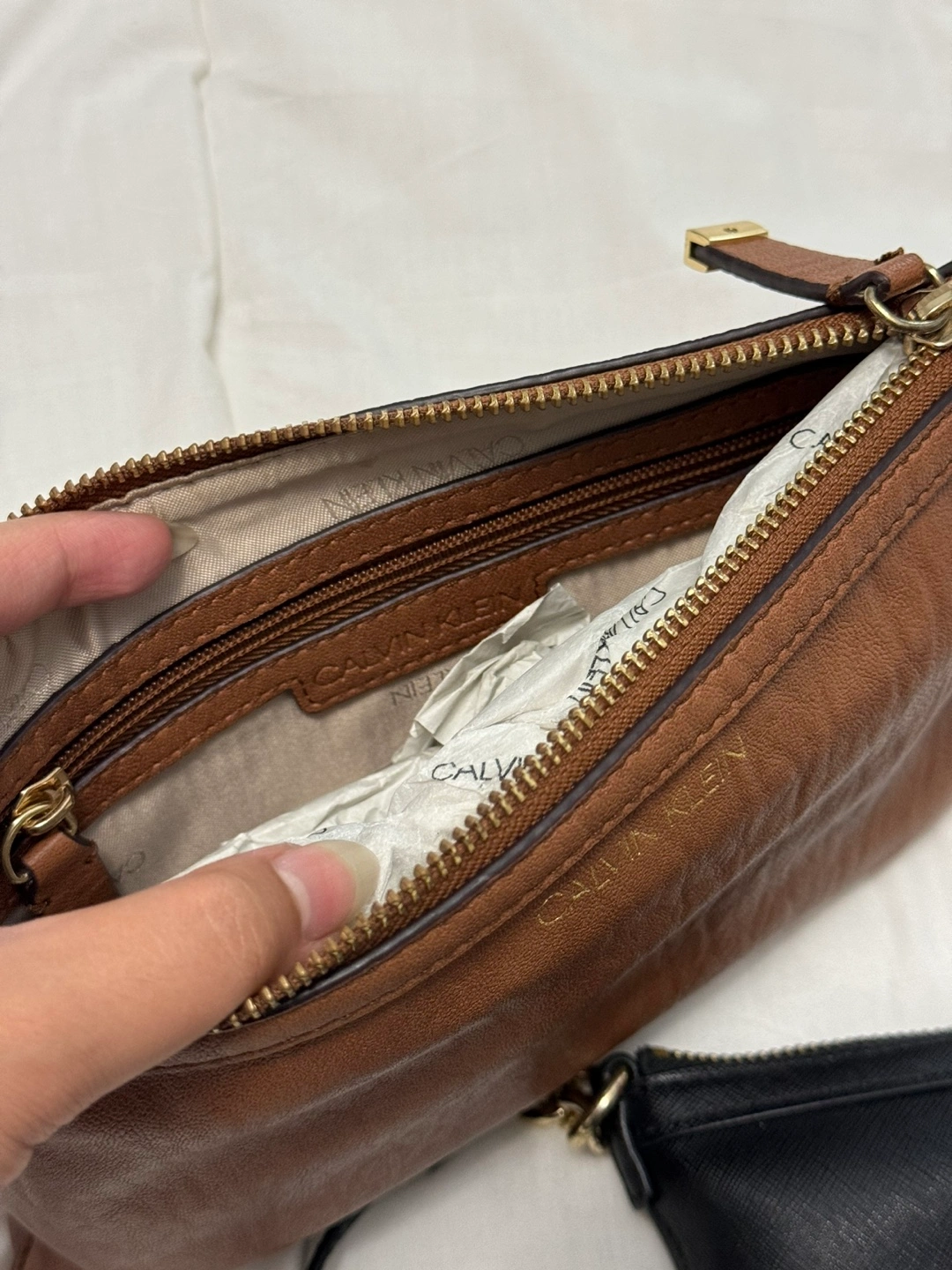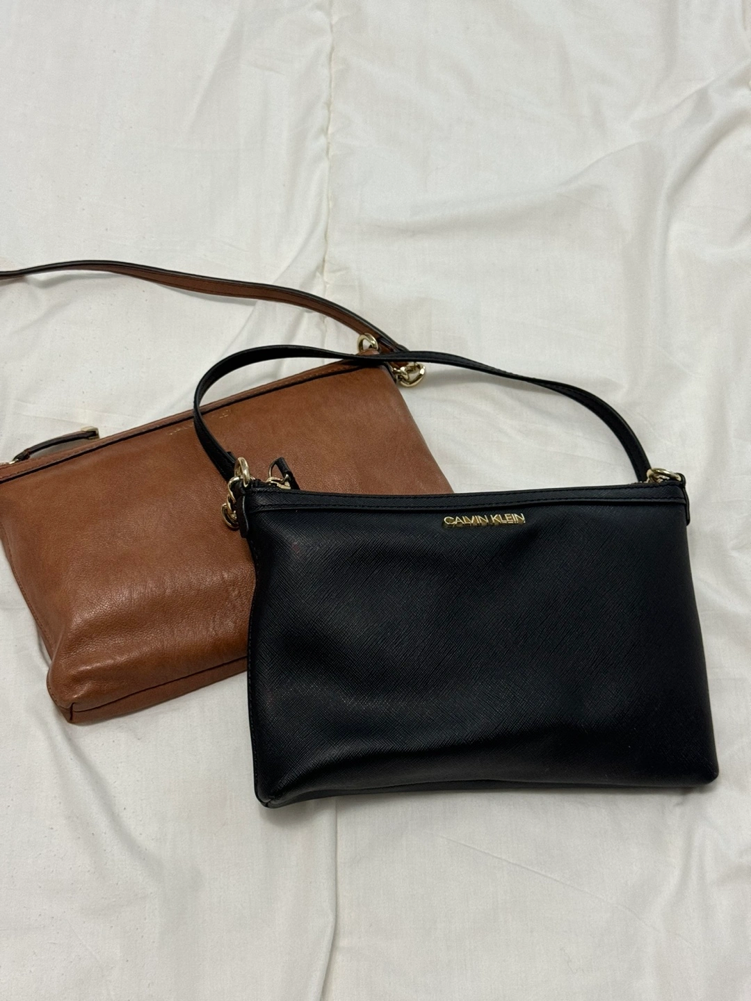 Two Calvin Klein shoulder bags, one brown and one black. $15 each