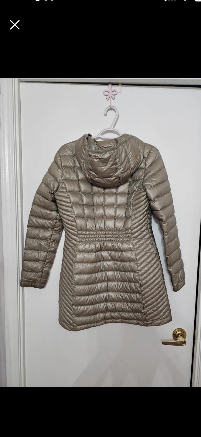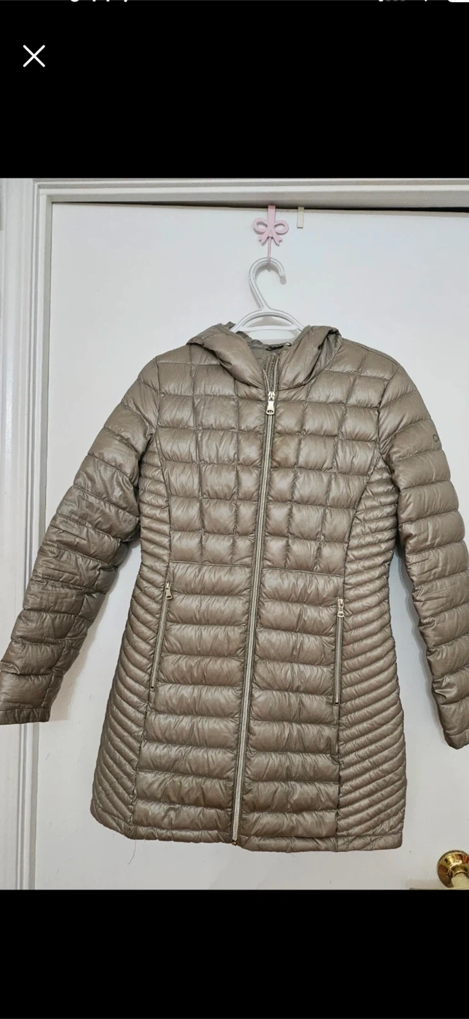 219Selling a Calvin Klein puffer jacket in a beautiful neutral tone! It's a size small and has a hood for extra warmth on those chilly days.