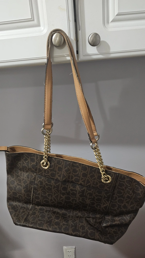 75Here's a Calvin Klein tote bag up for grabs! It features a stylish design with the brand's logo pattern, complemented by gold-tone chain detailing on the straps. A great everyday bag for carrying your essentials!