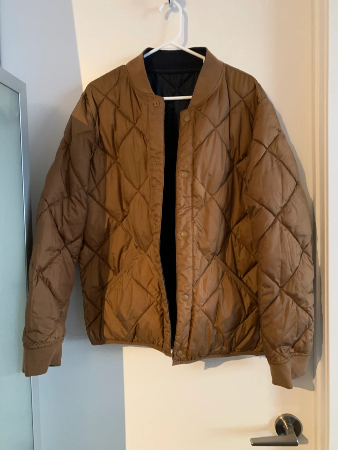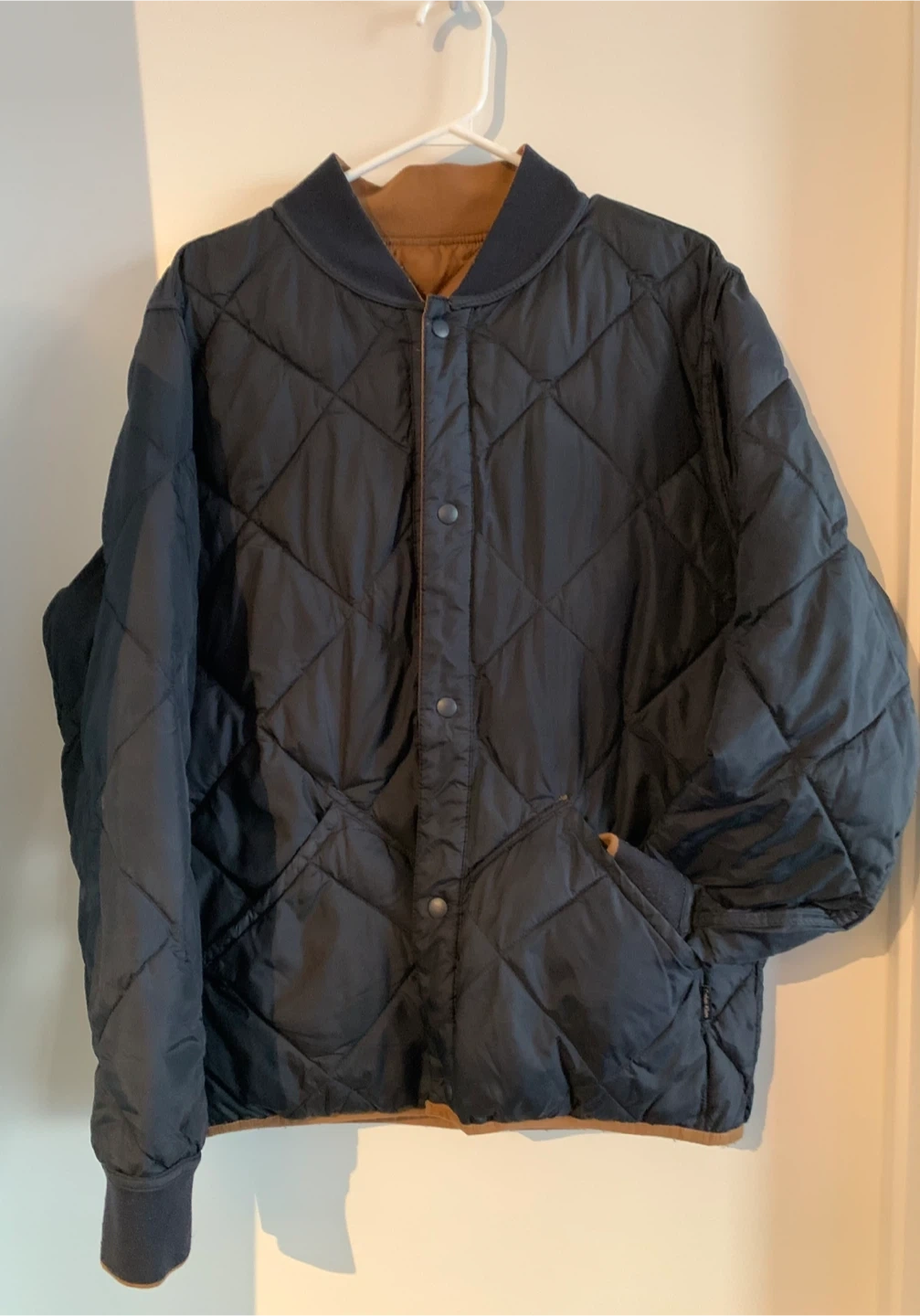 1000+✔️Cash & Pickup Only Please 📍Near Lake Shore Blvd W and Park Lawn. See Map on listing. 💛 Feel free to check out my other listings! ~~~~~ Selling a Calvin Klein reversible quilted lightweight puffer jacket. It's black (or Navy, sorry) on one side and brown on the other. In very good condition. Value: $226 (tax-in). • On both sides: -Calvin Klein Logo. -Pockets. -Zipper functioning very well. • Water/Wind resistant. • Snap buttons. • Outside material: Nylon. • Filling material: Sorona. Perfect for fall weather. So comfy! *All tags were removed for wearing it both sides. ❗️Approximative measurements on pics.