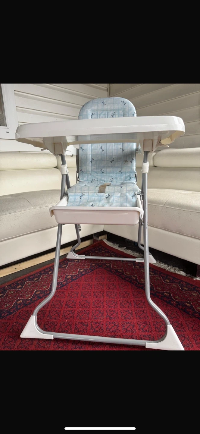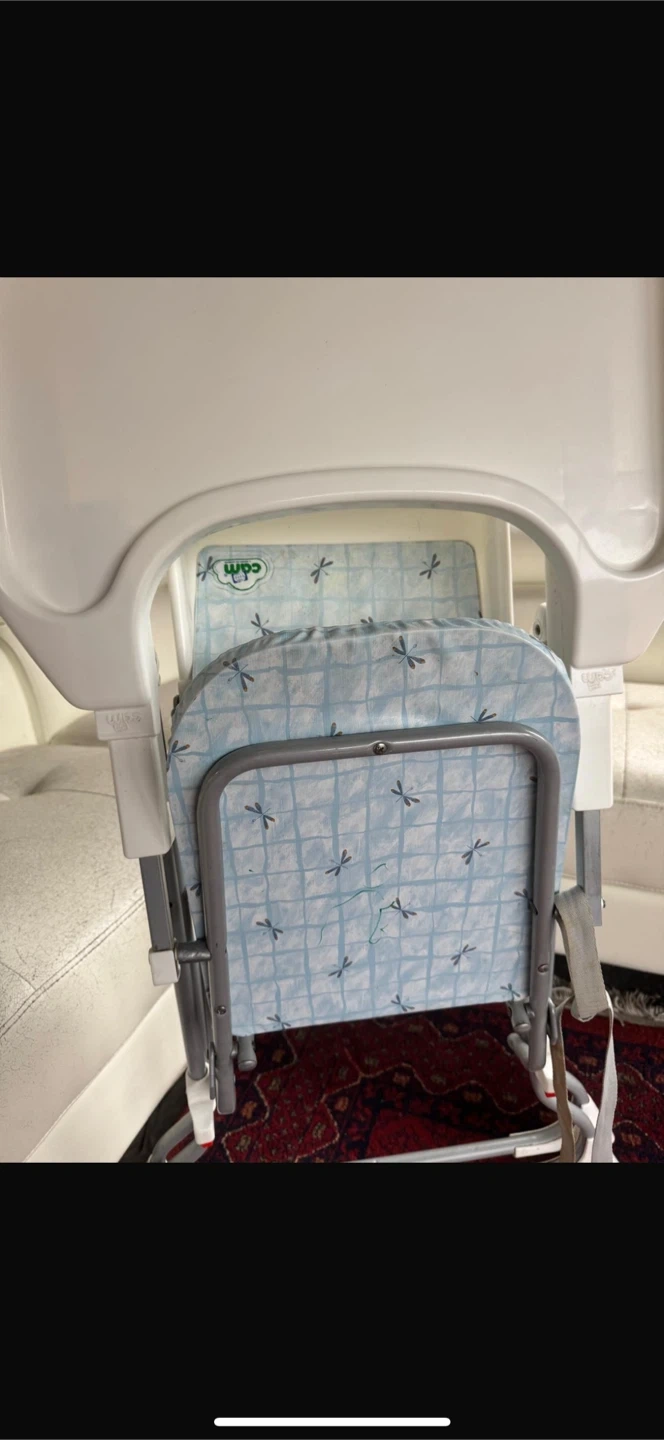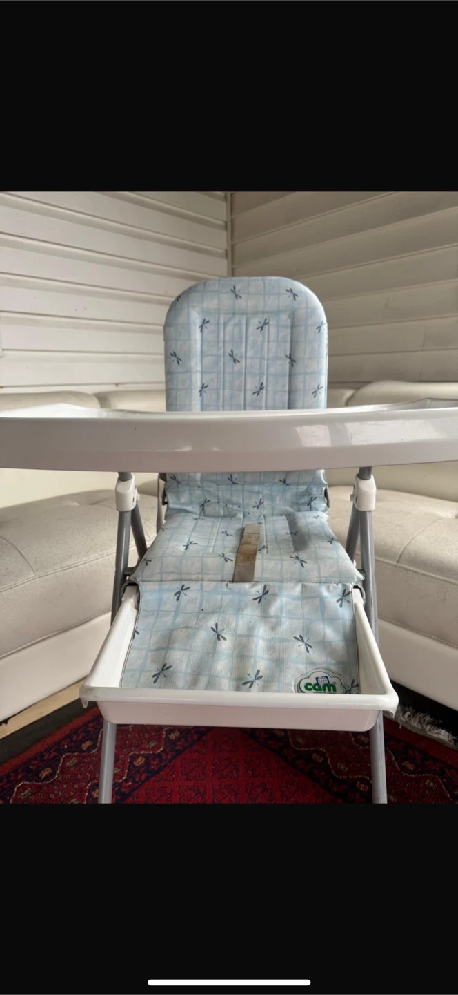 18Selling a gently used Cam baby high chair. It's in great condition and features a cute light blue dragonfly pattern on the seat and backrest. Perfect for meal times and folds up for easy storage!