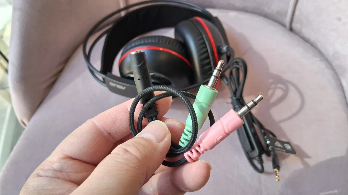 The connecting cable is accompanied by an extension with a Y-splitter that provides separate headphone and mic plugs. It also provides additional compatibility. The boom mic provides in-game communication.