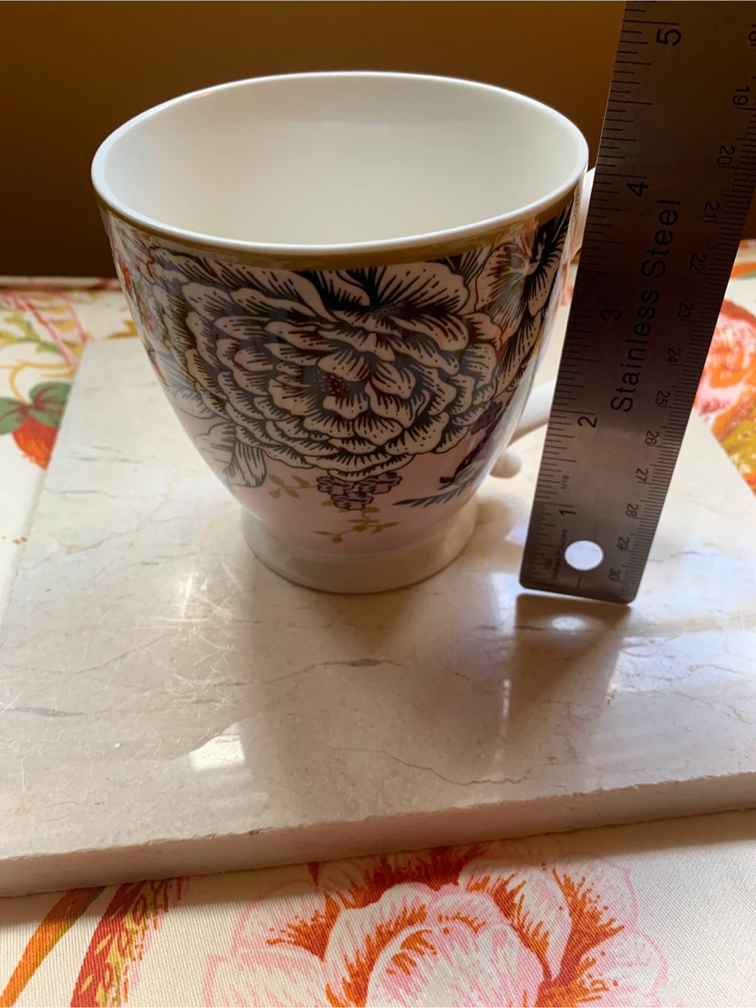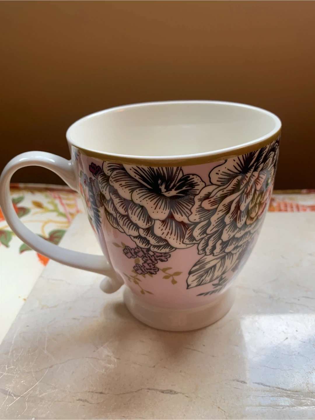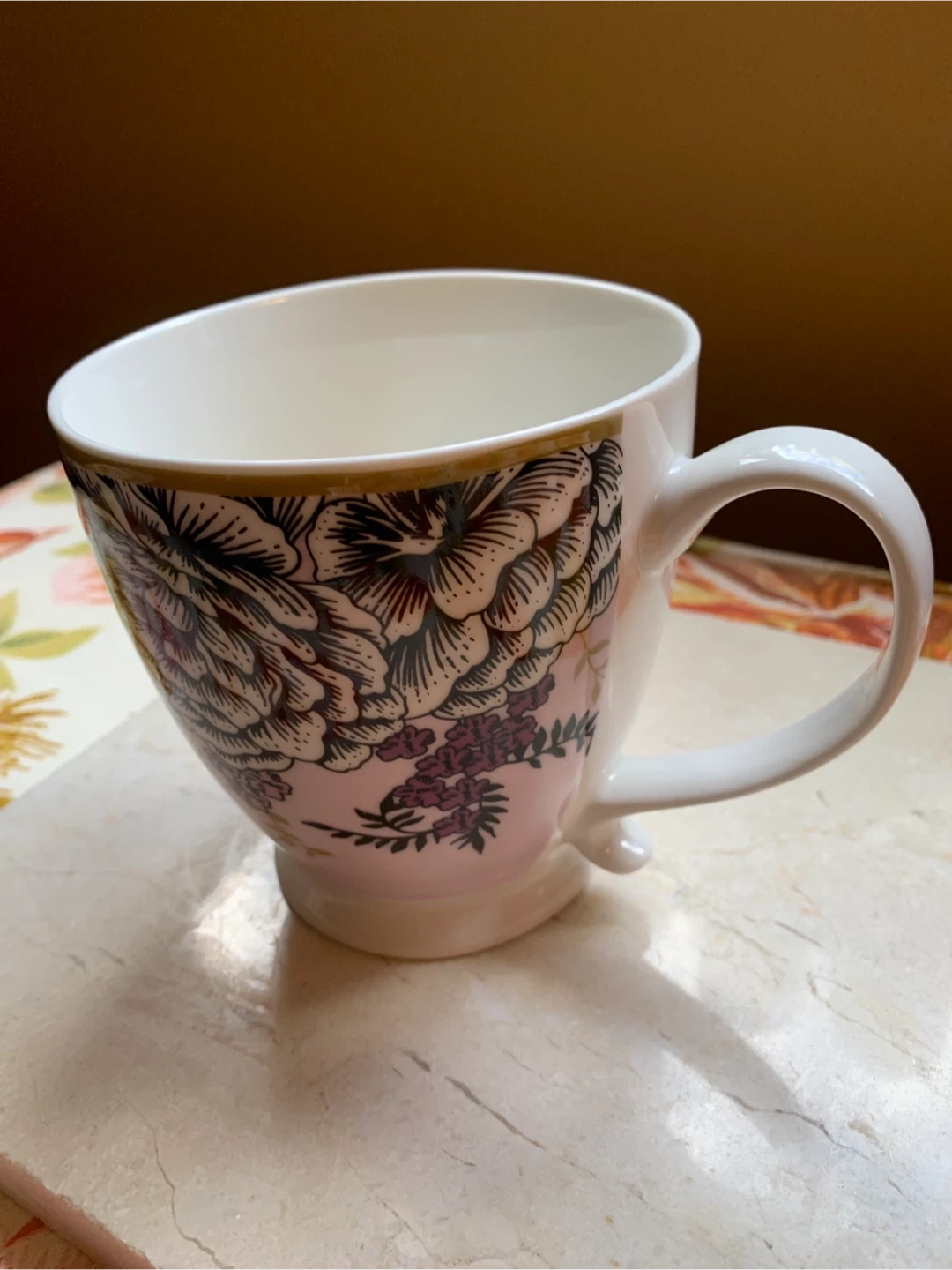 Selling a beautiful Cambridge English by Design mug! It features a lovely black and white floral design on a light pinky mauve background. No chips or cracks. Perfect for your morning coffee or tea! Cash only please. Riser not included.