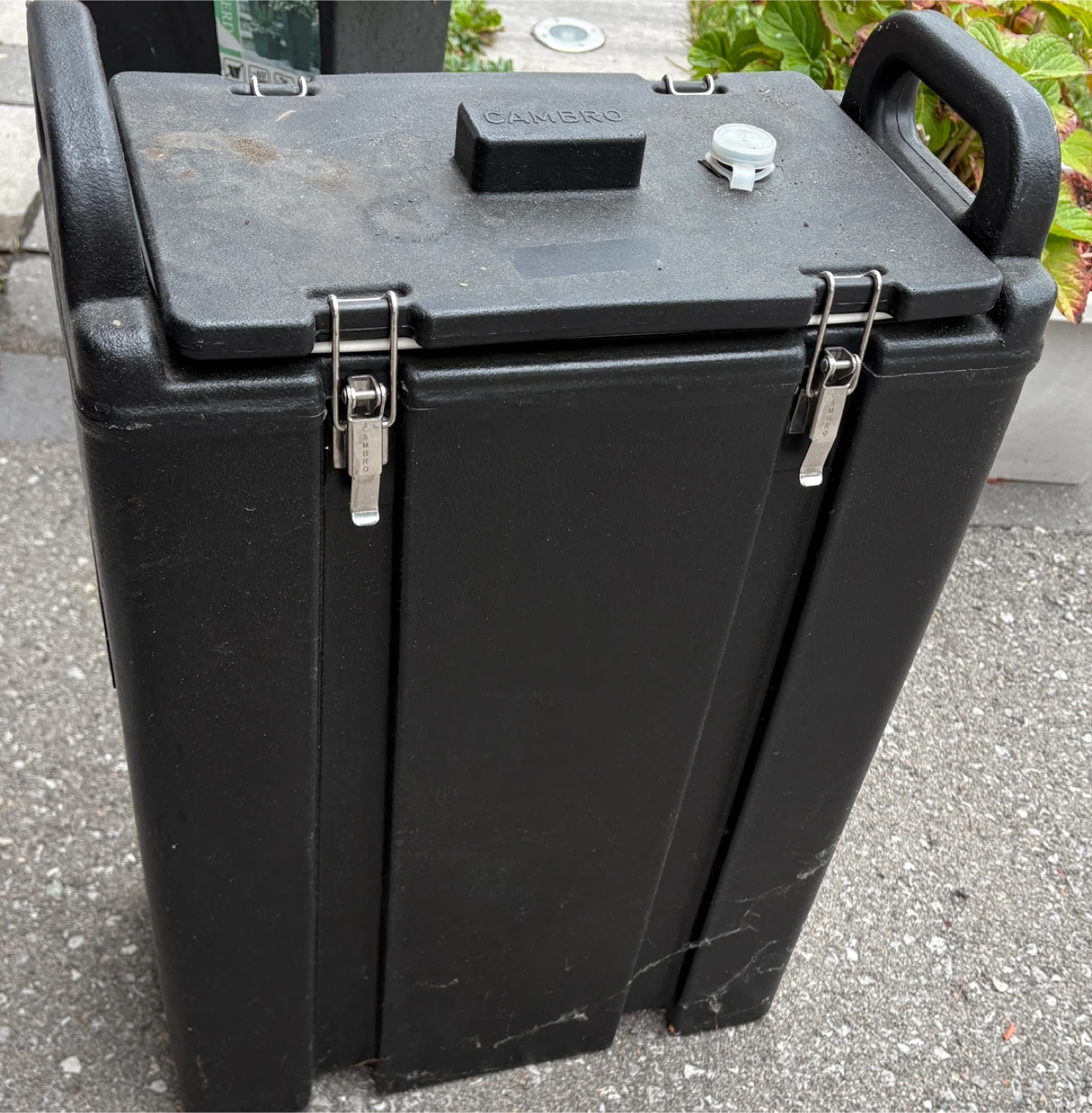 15I'm selling a Cambro coffee carrier. It's black and looks like it can hold a large amount of coffee. Perfect for catering or large events